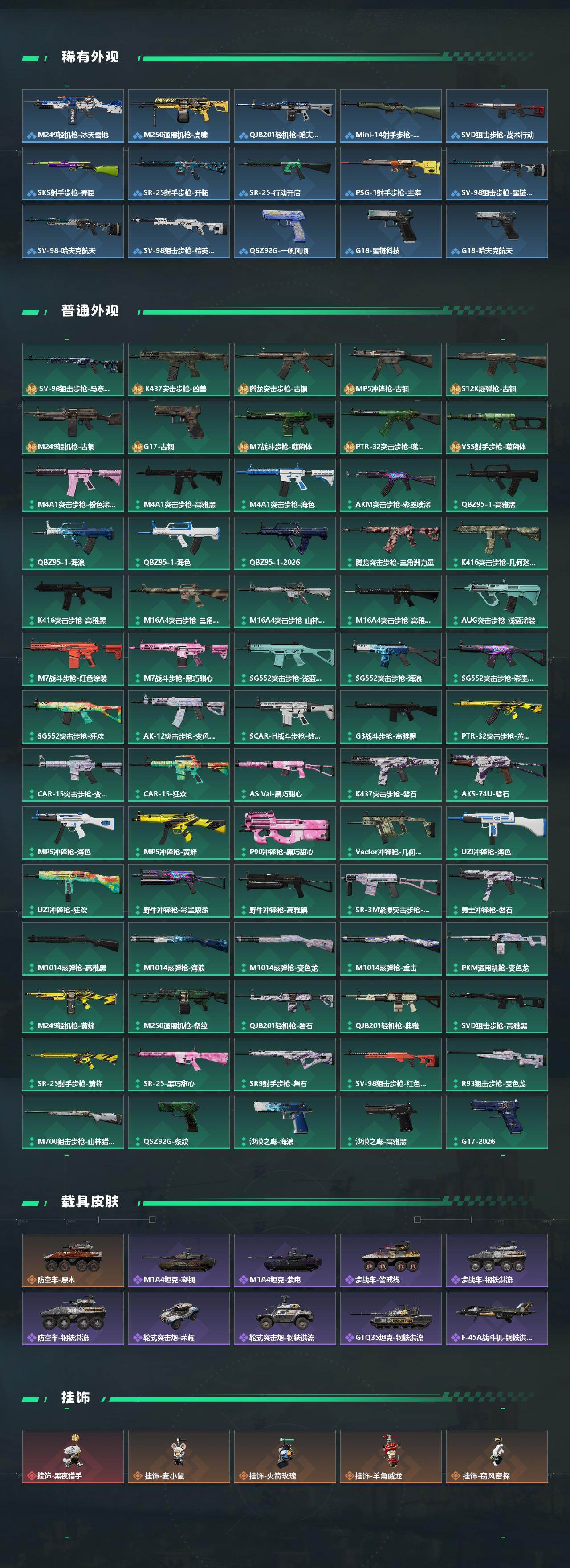 【传说外观】:M4A1突击步枪-蚀金玫瑰,M4A1突击步枪-阿米娅,AKM突击步枪-锦绣,M16A4突击步枪-狩猎时刻,M7战斗步枪-零度协议,SG552突击步枪-运动员,SG552突击步枪-点翠,SCAR-H战斗步枪-启航,G3战斗步枪-狩猎时刻,腾龙突击步枪-马年祥瑞,KC17突击步枪-电锯惊魂,KC17突击步枪-点翠,Vector