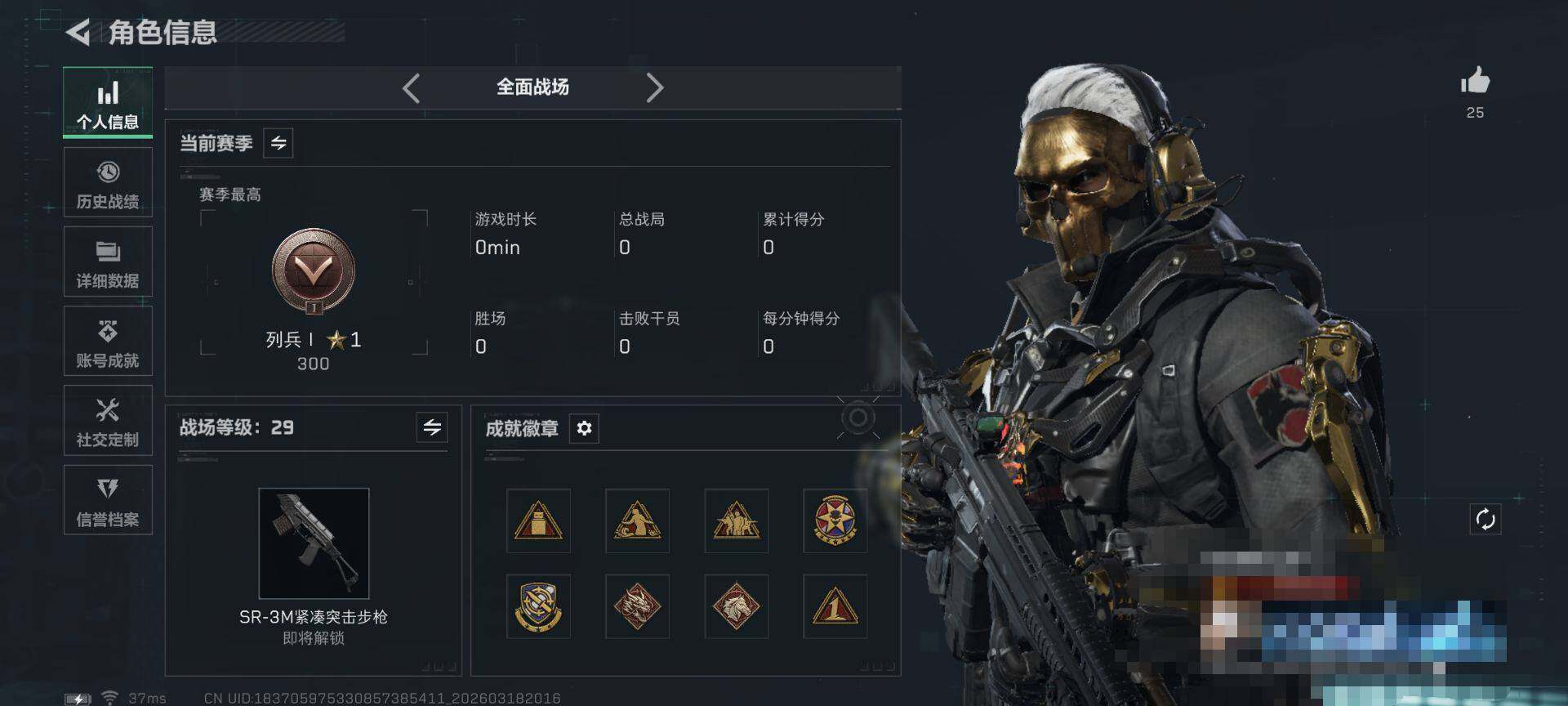86m总资产-32984k哈夫币-60烽火等级-黄金-29战场等级-列兵