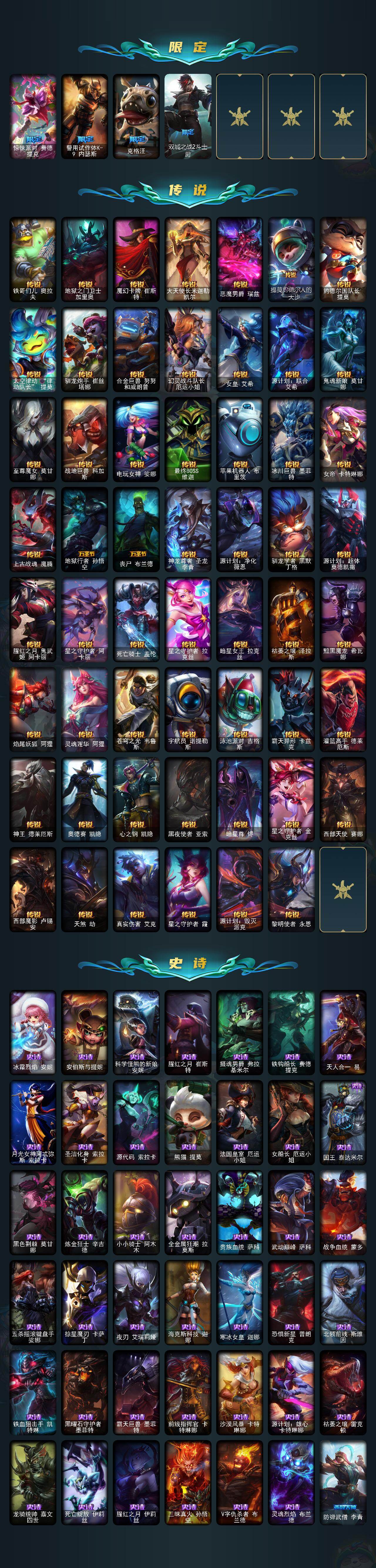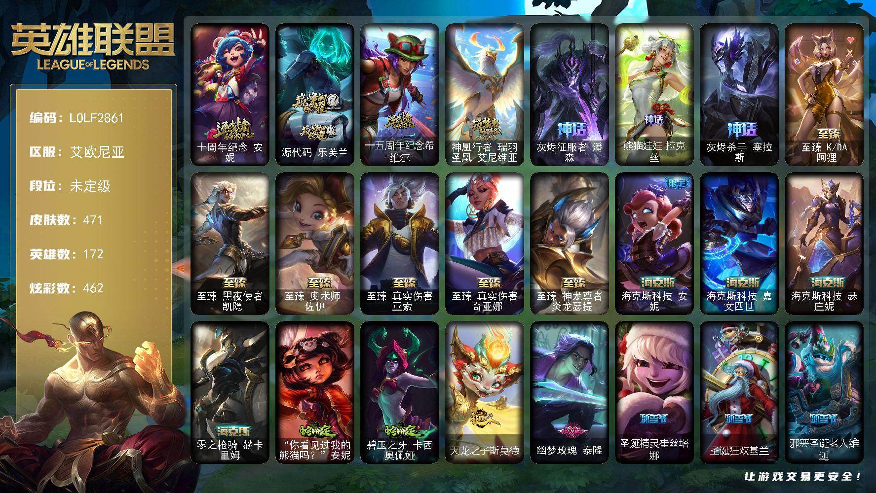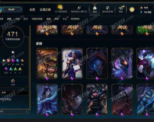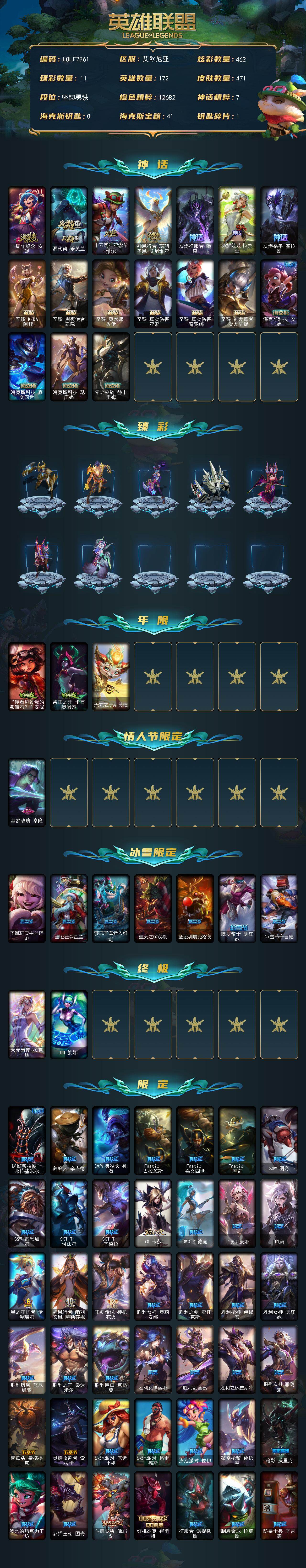 未定级段位-172英雄-471皮肤-462炫彩-2终极-17神话-58限定-55传说-106史诗