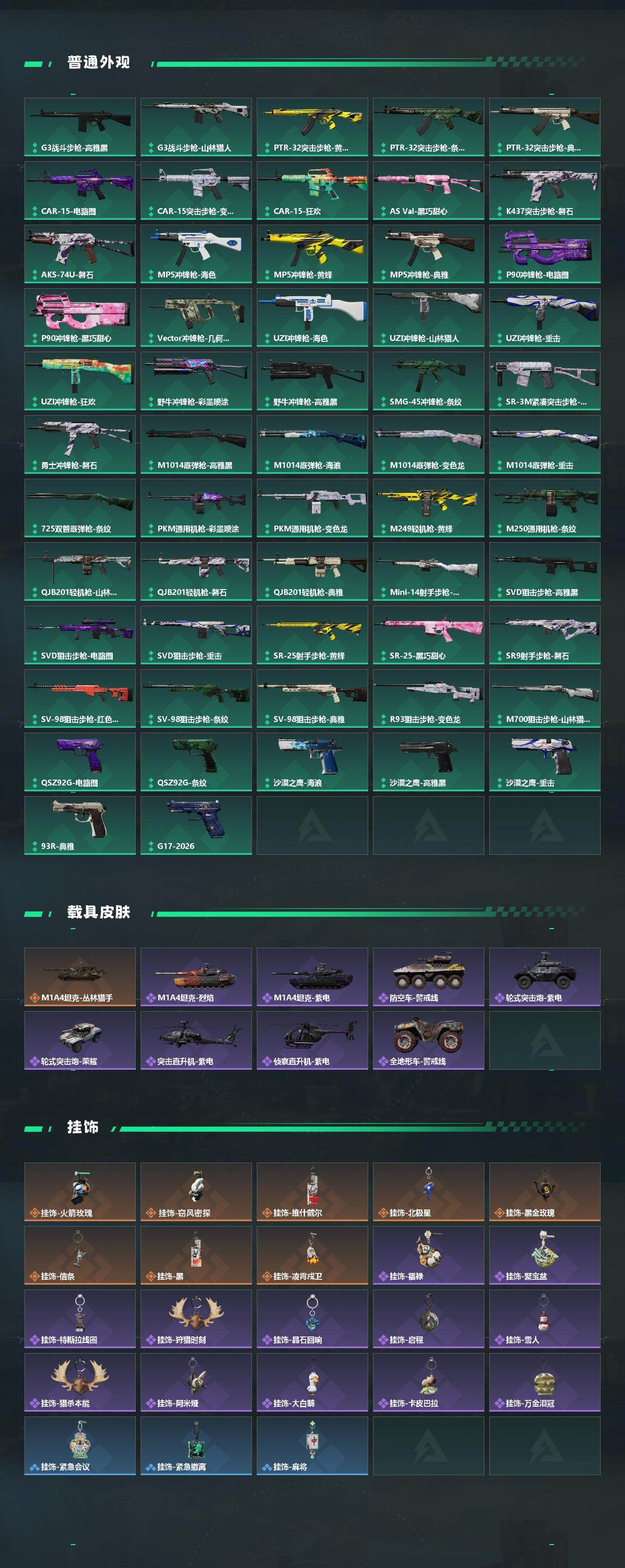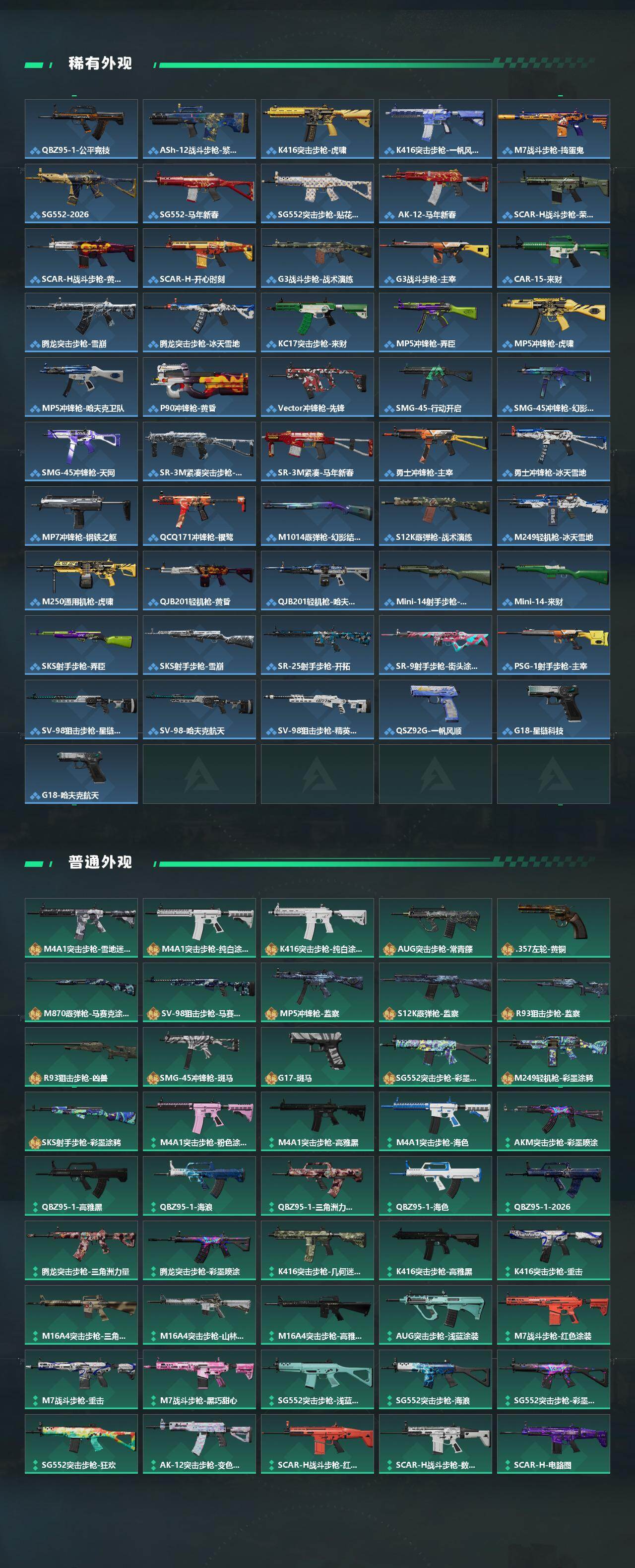 【传说外观】:M4A1突击步枪-蚀金玫瑰,M4A1突击步枪-阿米娅,QBZ95-1突击步枪-凌霄戍卫,ASh-12战斗步枪-鹅鸭杀,K416突击步