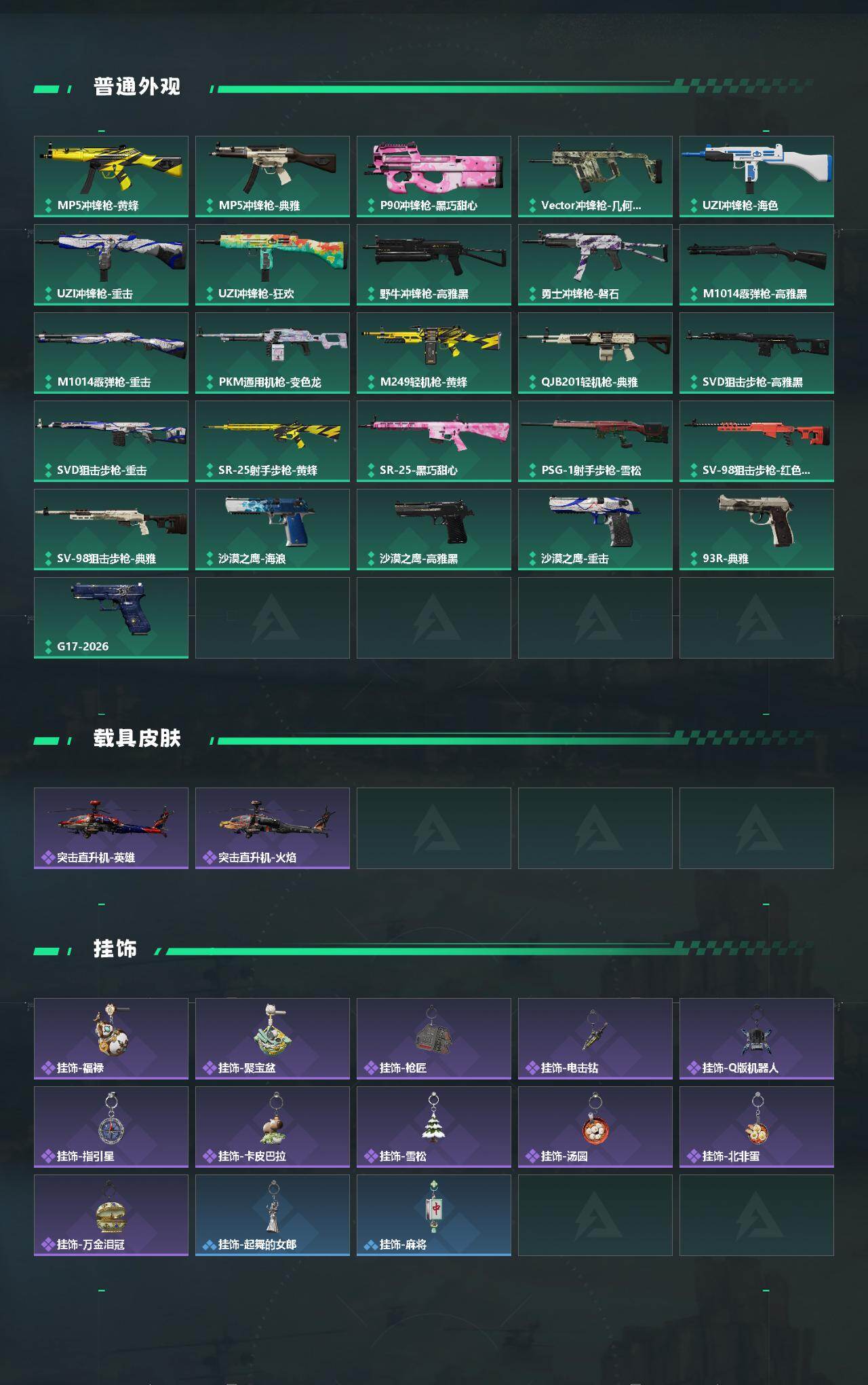【史诗外观】:QBZ95-1突击步枪-竞技风,K416突击步枪-冬日风情,K416突击步枪-腊梅,K416突击步枪-阿萨拉特攻,SG552突击步枪-哈夫克警备,腾龙突击步枪-猎鳄行动,K437突击步枪-丛影谍踪,Vector冲锋