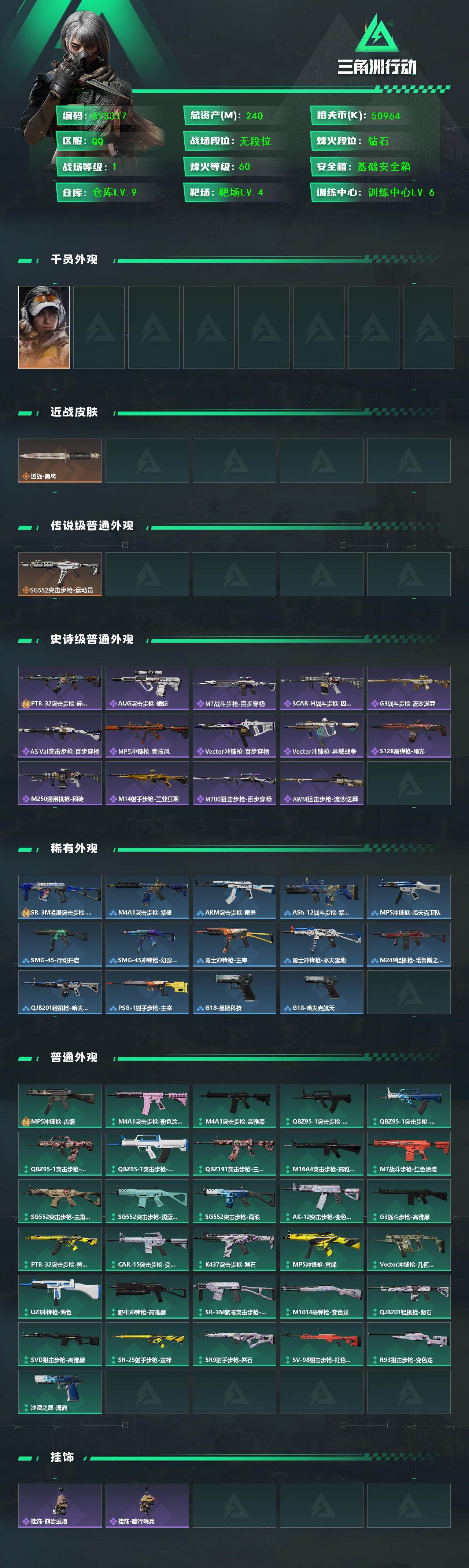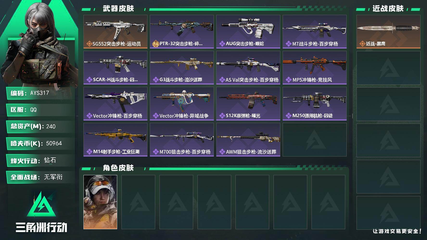 【特价出售/店主推荐】240m总资产-50964k哈伏币-60烽火等级-钻石-1战场等级-无军衔【干员外观】:露娜-金牌射手【近战皮肤】:近战-黑鹰【传说外观】:SG552突击步枪-运动员【史诗外观】:PTR-32突击步枪-碎冰行动,AUG突击步枪-蝮蛇,M7战斗步枪-百步穿杨,SCAR-H战斗步枪-囚徒,G3战斗步枪-流沙送葬,AS Val突击步枪-百步穿杨,MP5冲锋枪-竞技风,Vector冲锋枪-百步穿杨,Vector冲锋枪-异域战争,S12K霰弹枪-曙光,M250通用机枪-囚徒,M14射