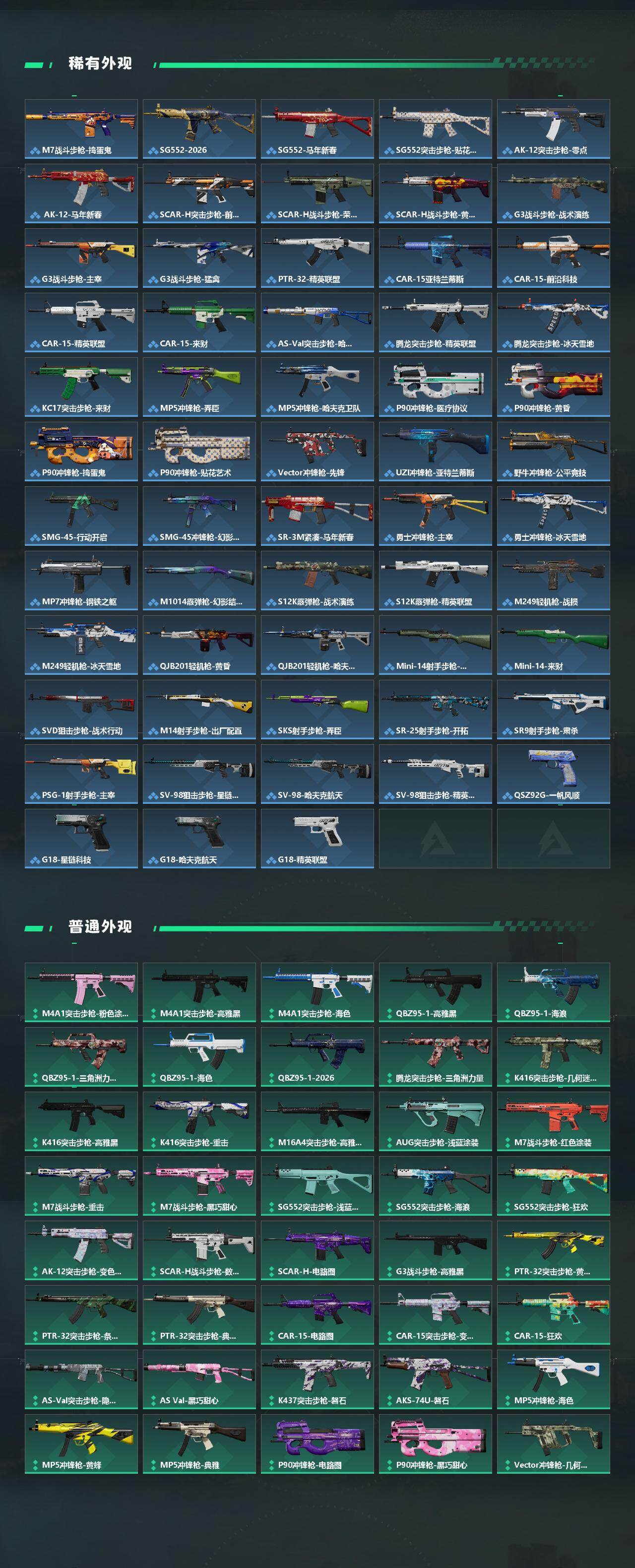 【传说外观】:M4A1突击步枪-蚀金玫瑰,M4A1突击步枪-阿米娅,AKM突击步枪-锦绣,QBZ95-1突击步枪-凌霄戍卫,ASh-12战斗步枪-鹅鸭杀,K416突击步枪-尖峰行动,K416突击步枪-行动记录,M7战斗步枪-零度协议