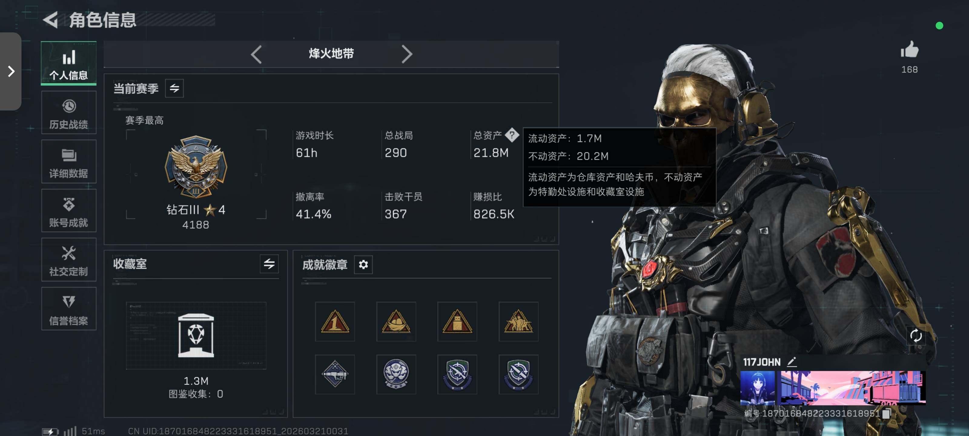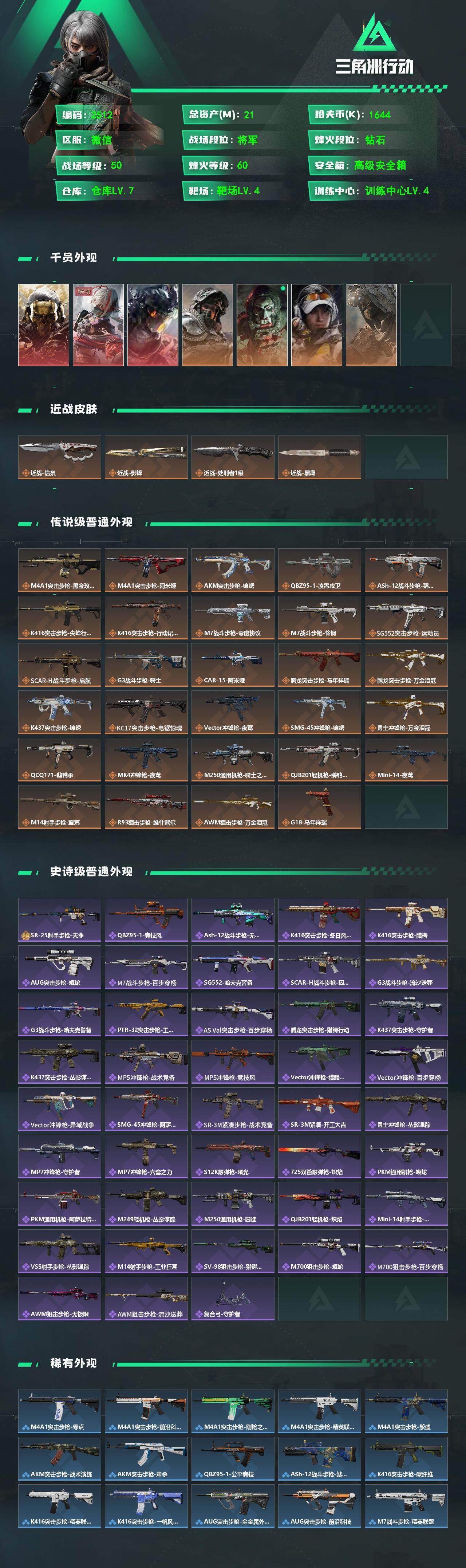 21m总资产-1644k哈夫币-60烽火等级-钻石-50战场等级-将军