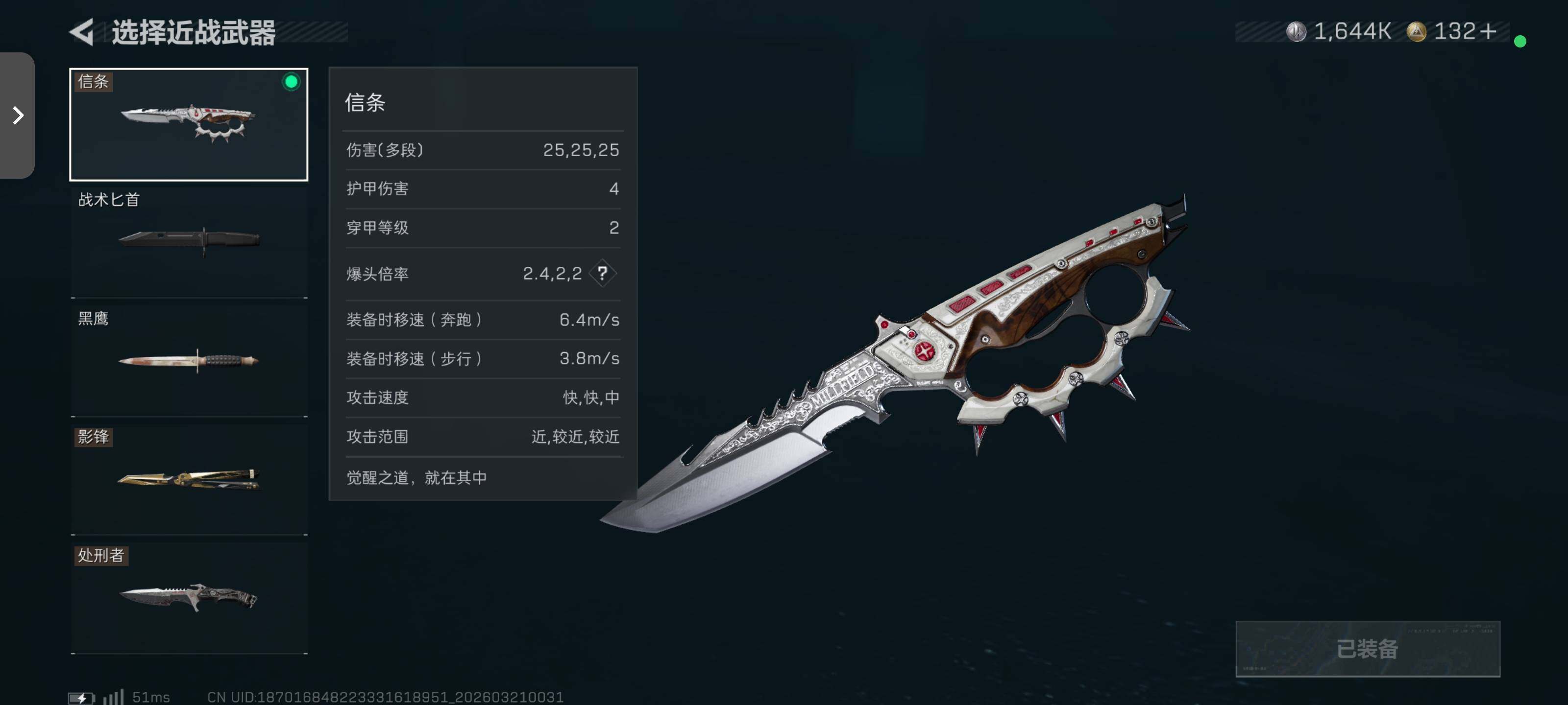 【近战皮肤】:近战-信条,近战-影锋,近战-处刑者1级,近战-黑鹰