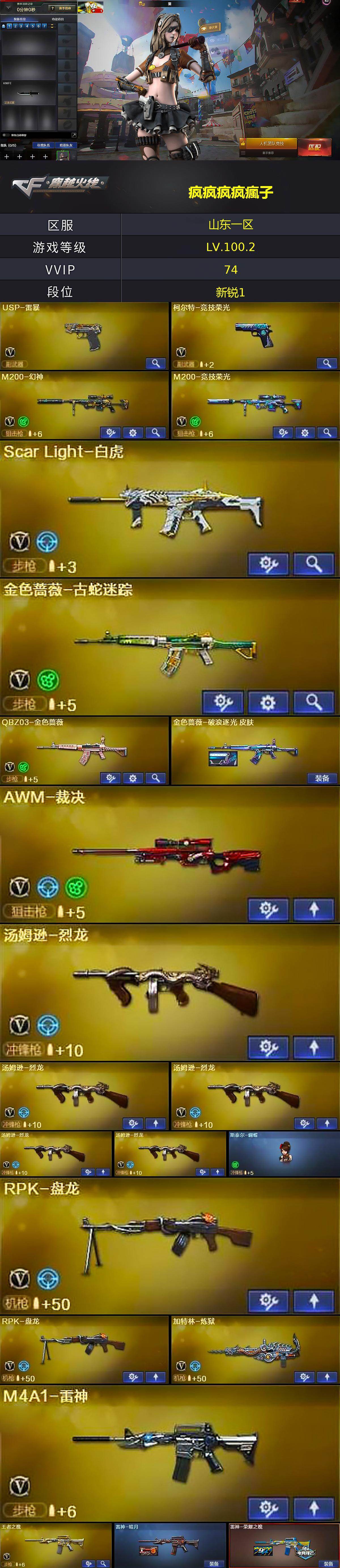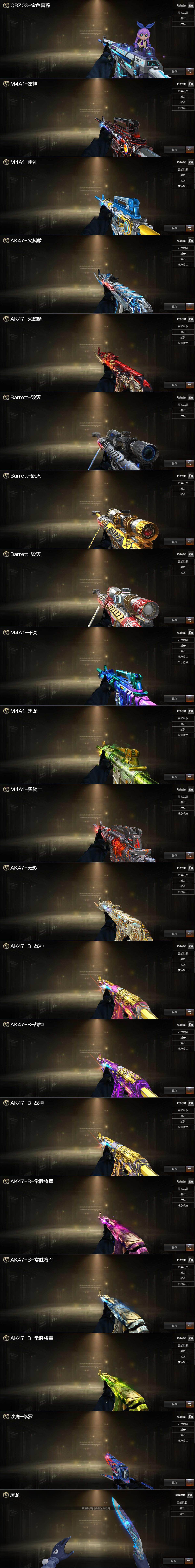 【热门武器】:QBZ03-金色蔷薇,Scar Light-白虎,M200-幻神,金色蔷薇-古蛇迷踪,修罗-古蛇迷踪,M200-竞技荣光,死亡之眼,M4A1-黑骑士,汤姆逊-烈龙*5,RPK-盘龙*2,加特林-炼狱,斯泰尔-蝴蝶,火麒麟-绝迹,USP-雷暴,沙鹰-修罗*2
