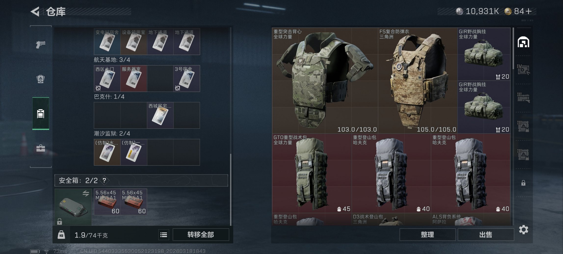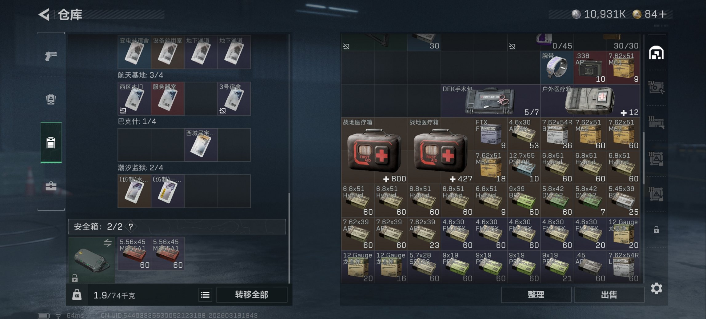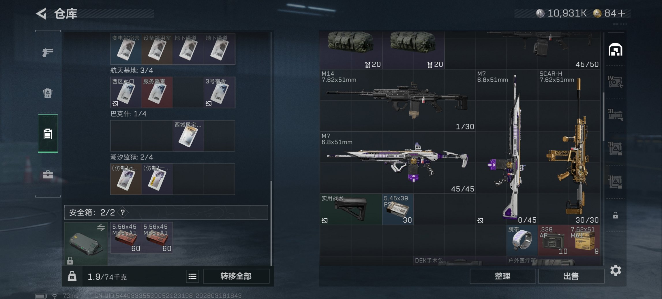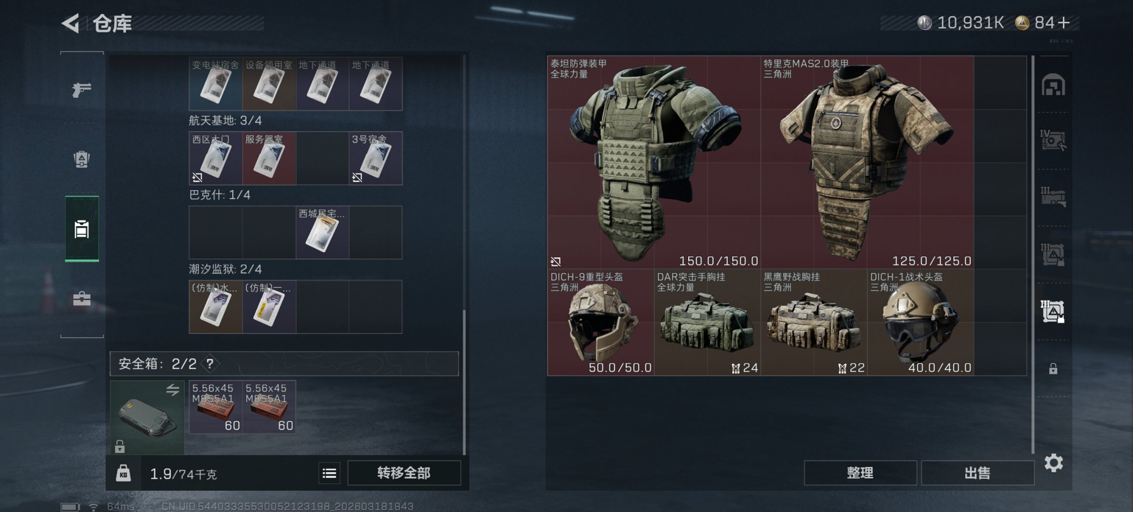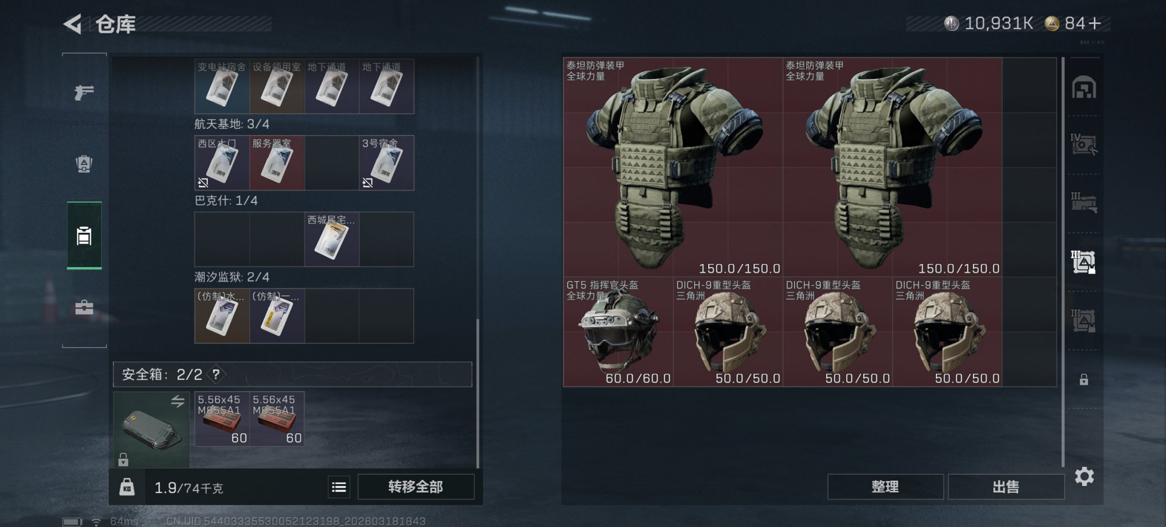 总资产66M 10颗AW子弹 哈夫币10,931K,行动等级:56,仓库等级:5级,训练中心等级:6级,靶场等级:2级,干员皮肤:2,枪皮:109