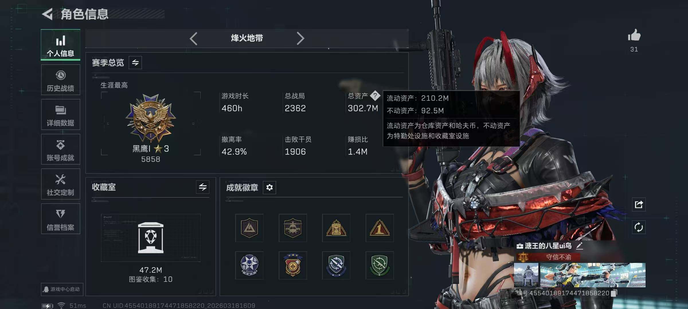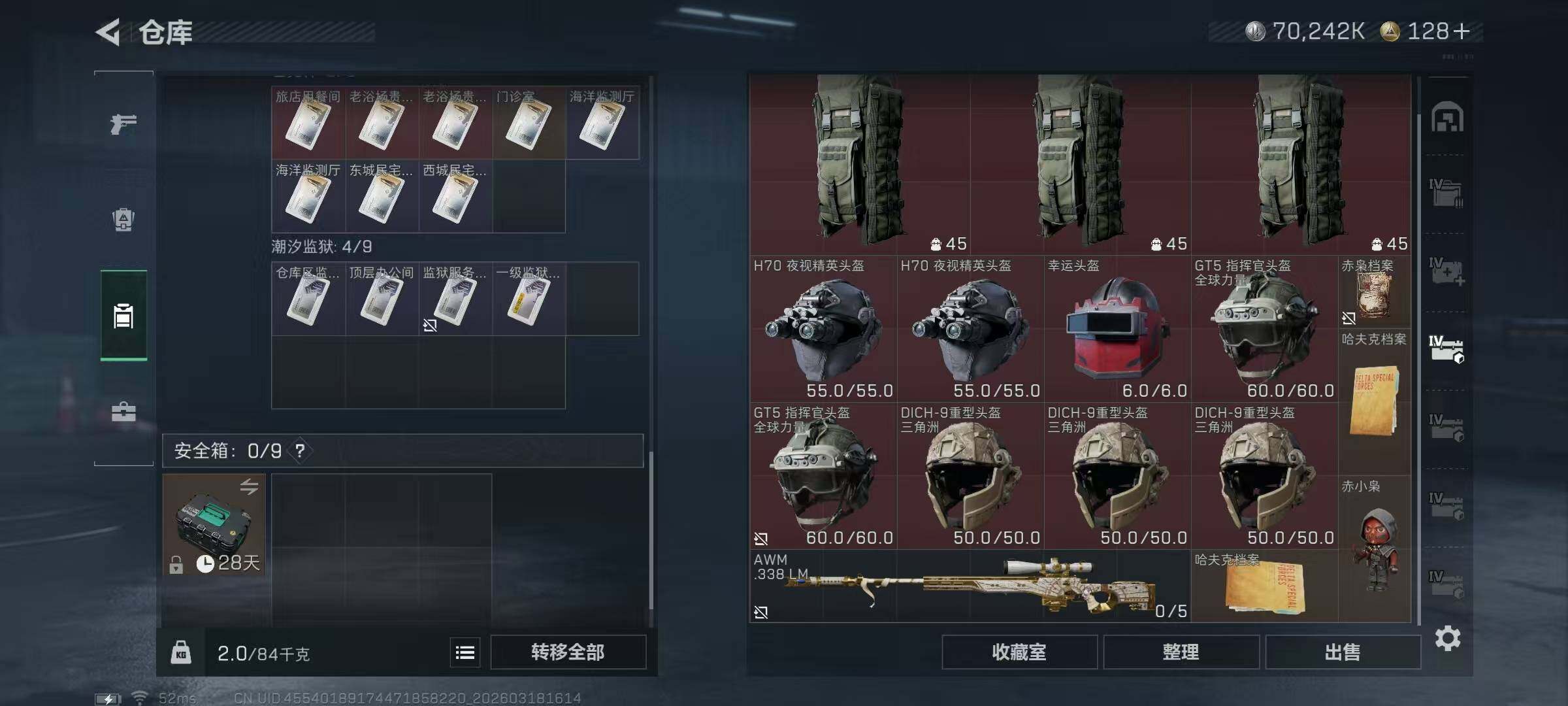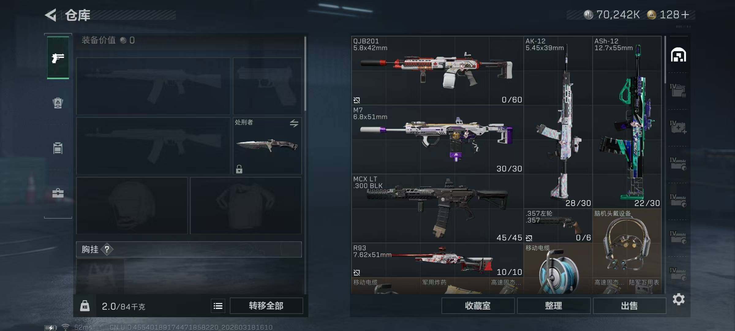 【SJ1454】【无封禁中产带S8顶级3X3】60级/总资302M/流资210M/128点卷/刀皮(处刑者)红狼(电锯惊魂)乌鲁鲁(荒原猎手)深蓝(不破誓约)露娜(金牌射手)骇爪(维什戴尔)/9级仓库6级体力6级负重3级潜水/20发AW子弹+327发其他红弹