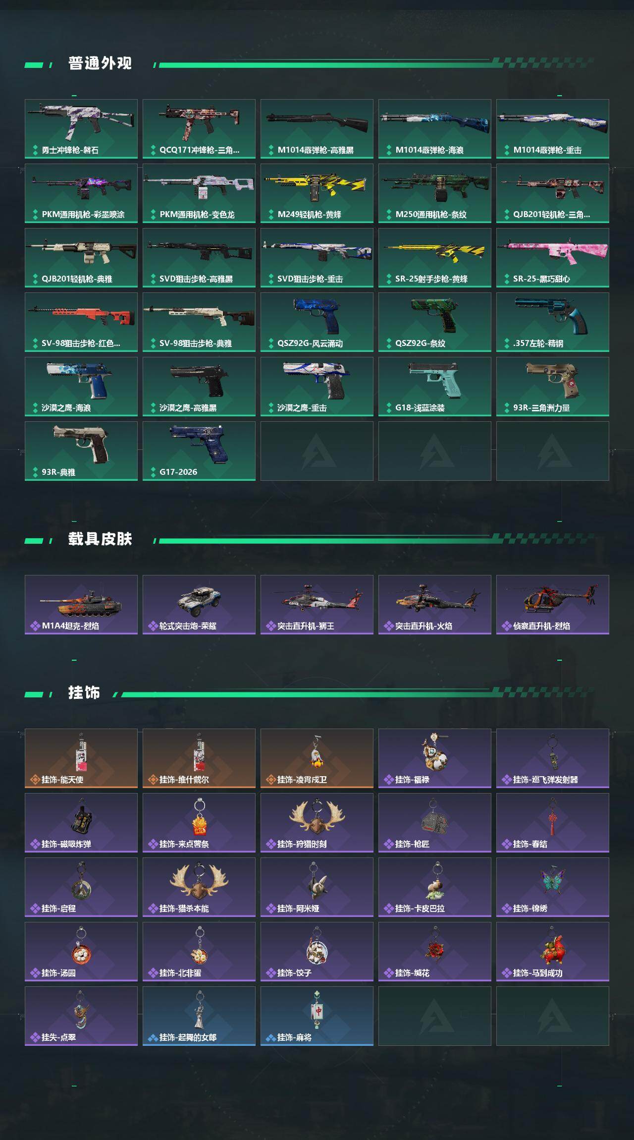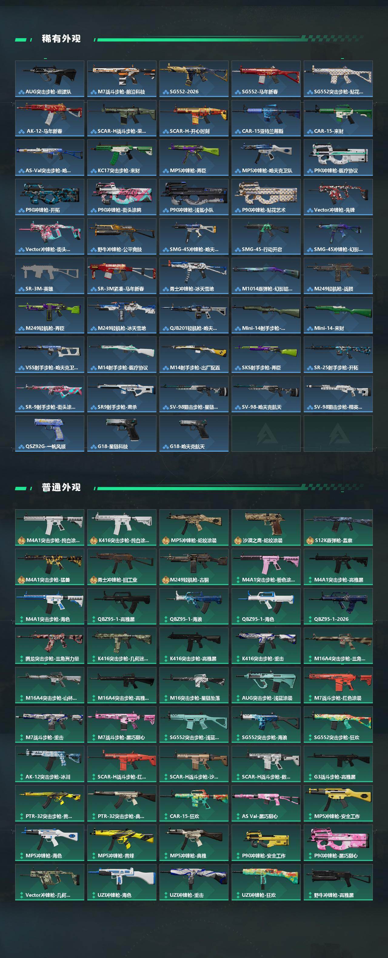 【传说外观】:M4A1突击步枪-蚀金玫瑰,M4A1突击步枪-阿米娅,AKM突击步枪-锦绣,QBZ95-1突击步枪-凌霄戍卫,M16A4突击步枪-狩猎时刻,SG552突击步枪-点翠,SCAR-H战斗步枪-启航,G3战斗步枪-狩猎时刻,CAR-15突击步枪-阿米娅,AS Val突击步枪-蛇