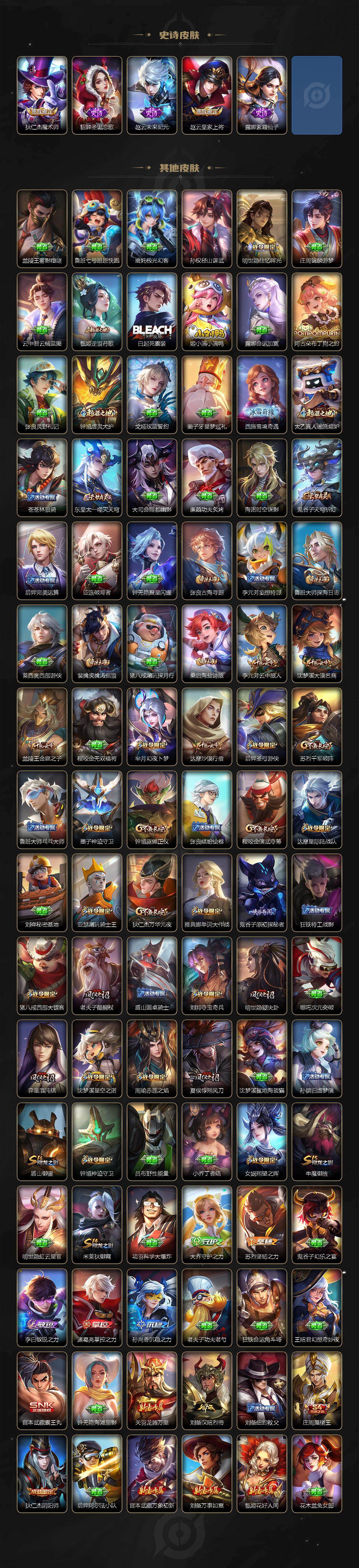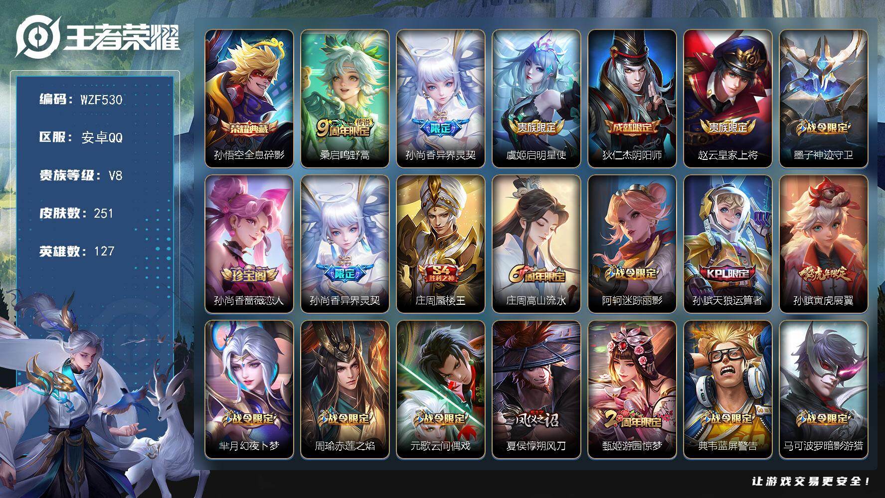 V8-荣耀黄金I段位-127英雄-251皮肤-1典藏皮肤-3传说-58史诗 【英雄全皮】:孙权全皮 【荣耀典藏】:孙悟空全息碎影 【传说皮肤】:桑启鸣野蒿,孙尚香异界灵契,虞姬启明星使