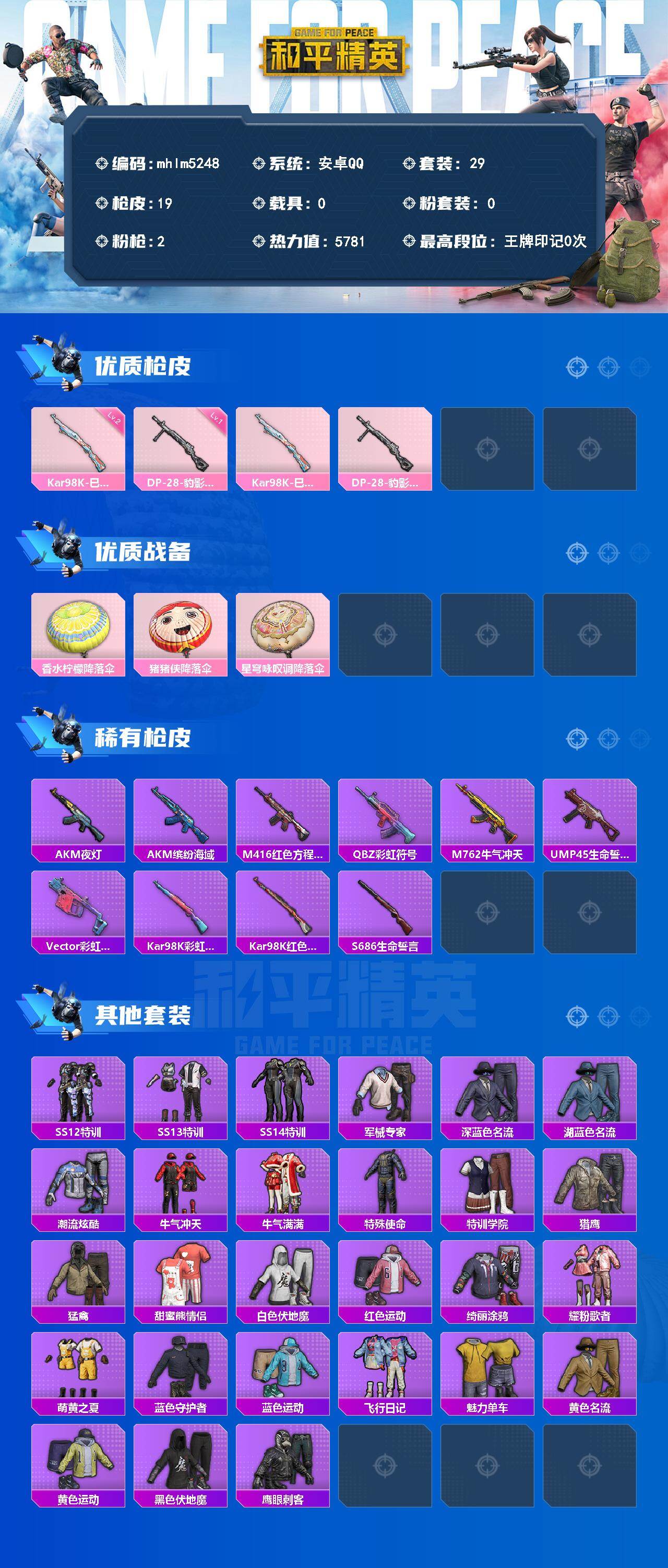 【mhlm5248】安卓 手Q-0粉装-2特效枪-0载具-0粉色飞行器-5781热力值-0王牌印记-29套装-19枪皮