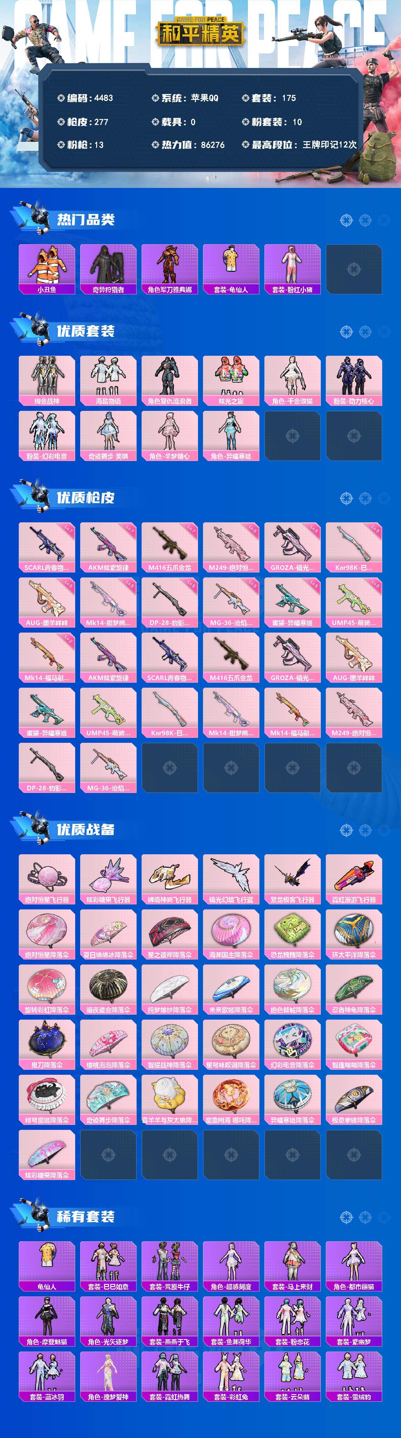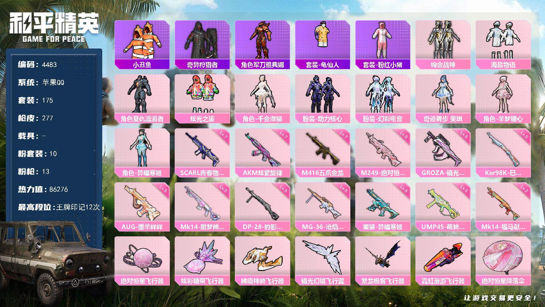 满级地铁苹果 手Q-10粉装-13特效枪-0载具-6粉色飞行器-86276热力值-12王牌印记-175套装-277枪皮