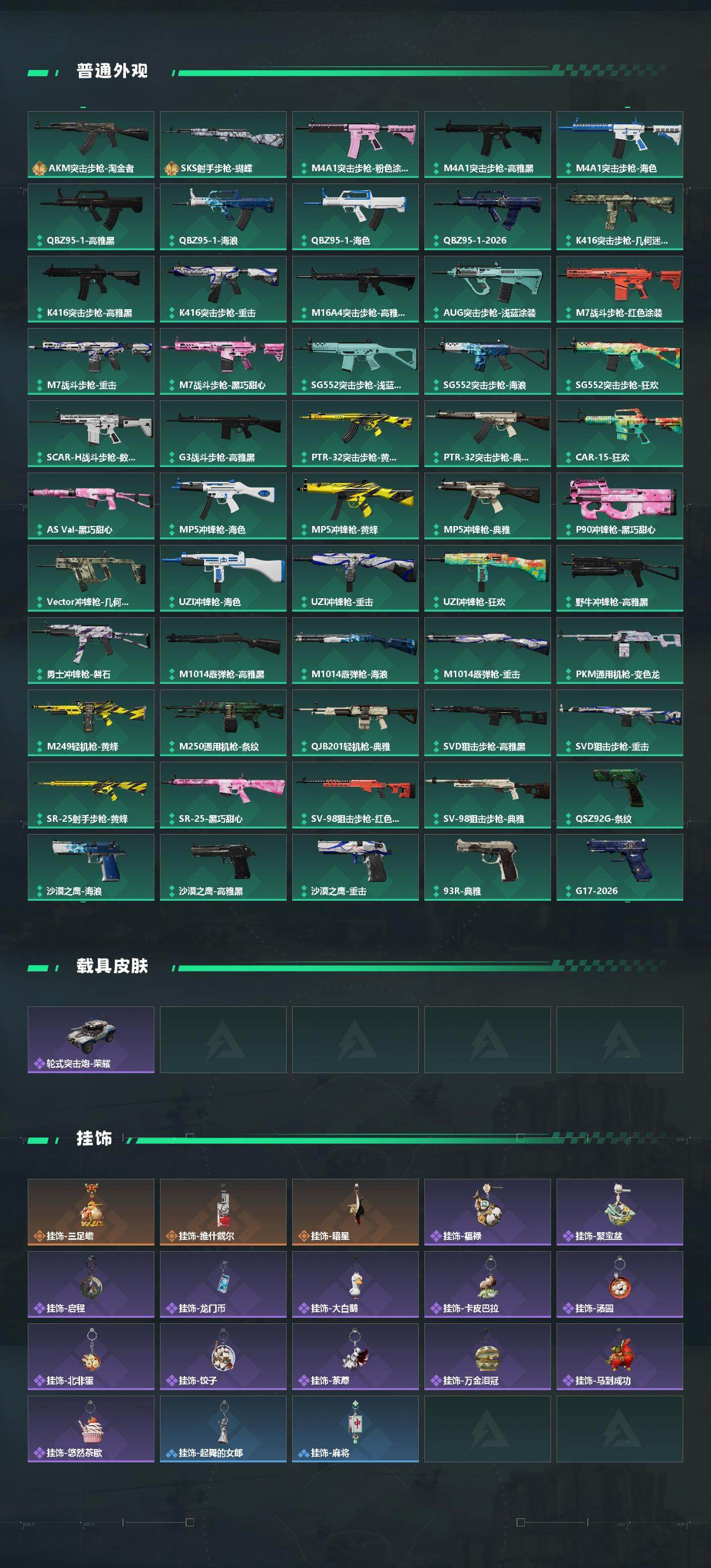 【传说外观】:M4A1突击步枪-阿米娅,ASh-12战斗步枪-鹅鸭杀,K416突击步枪-行动记录,AUG突击步枪-悠然茶歇,SCAR-H战斗步枪-水墨云图,SCAR-H战斗步枪-启航,SCAR-H战斗步枪-荼蘼,G3战斗步枪-骑士,CAR-15突击