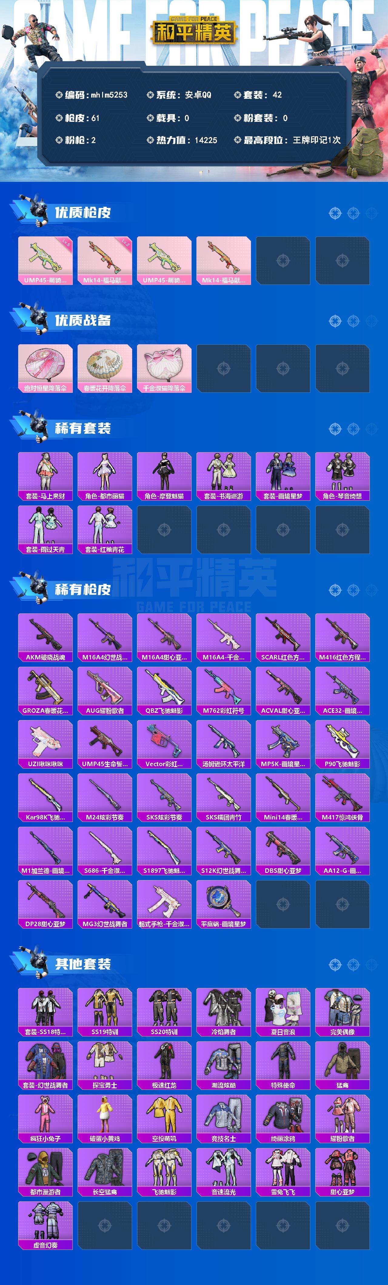 【mhlm5253】安卓 手Q-0粉装-2特效枪-0载具-0粉色飞行器-14225热力值-1王牌印记-42套装-61枪皮