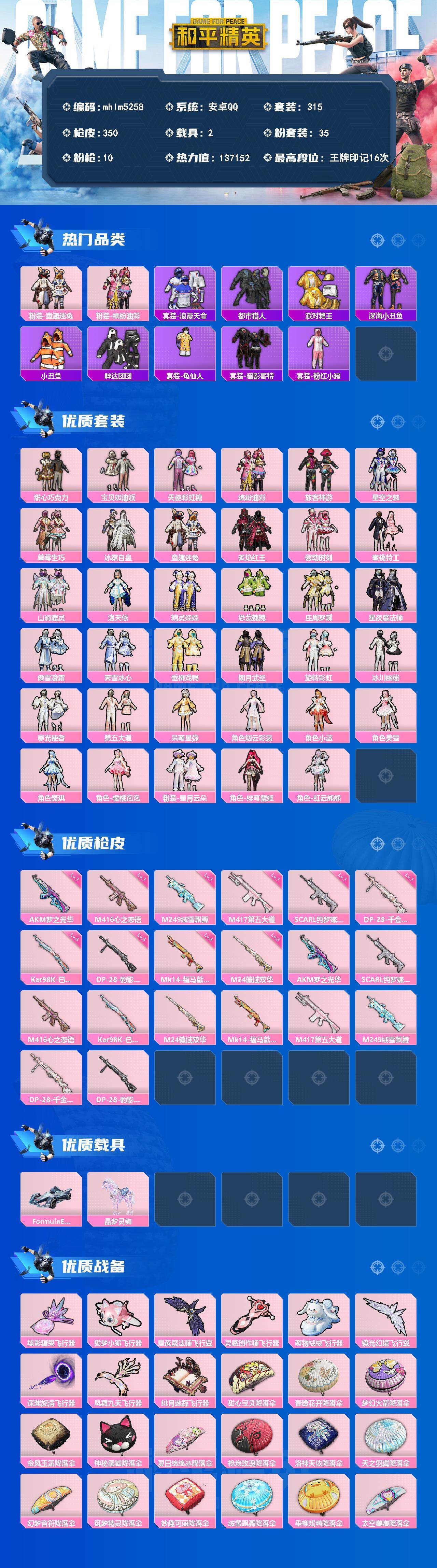 【mhlm5258】安卓 手Q-35粉装-10特效枪-2载具-9粉色飞行器-137152热力值-16王牌印记-315套装-350枪皮
