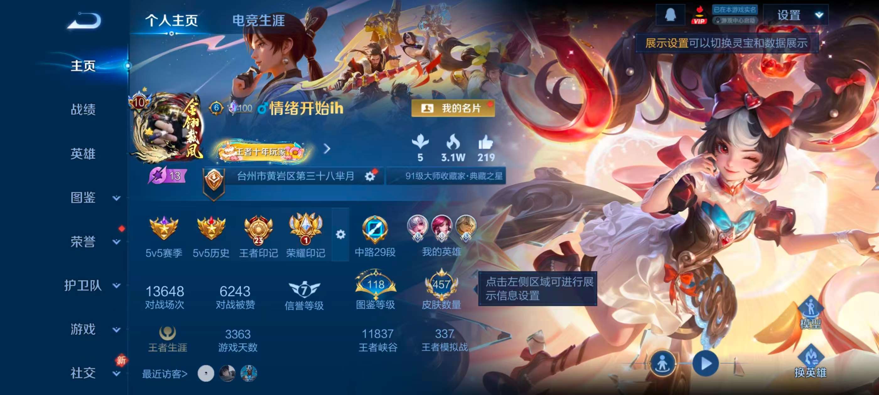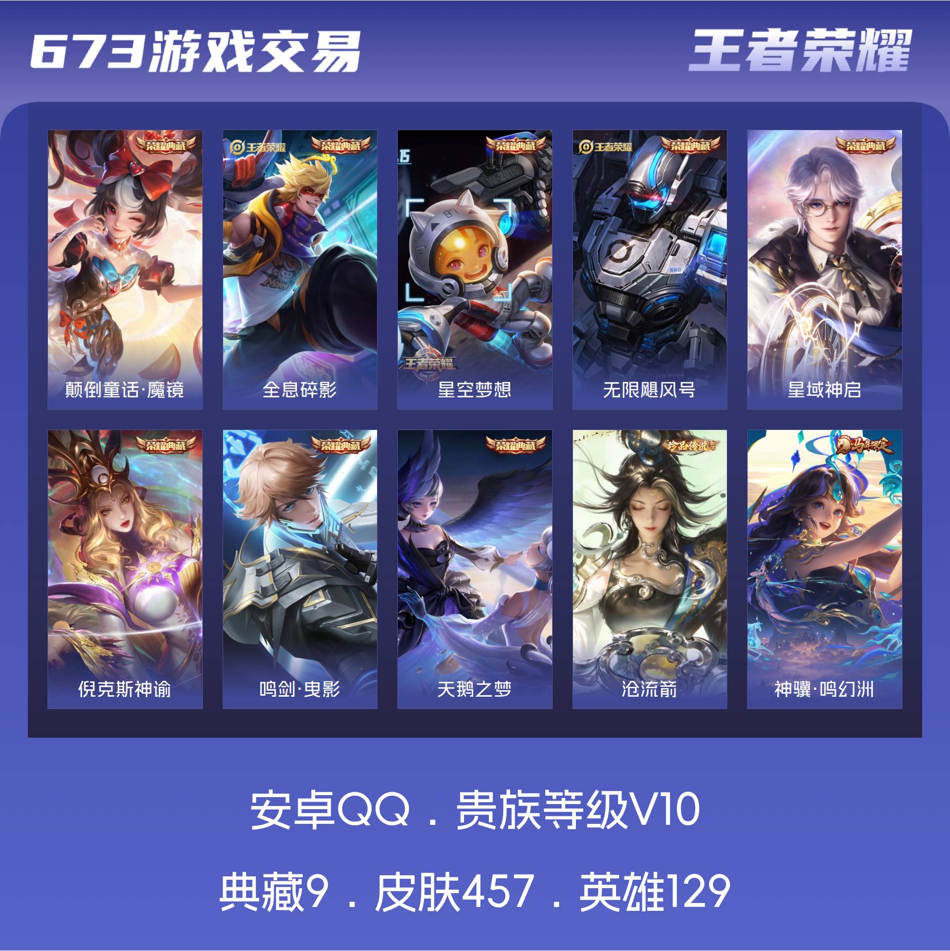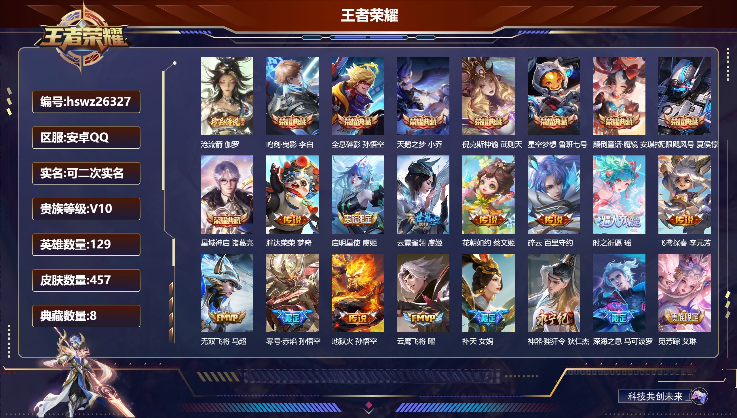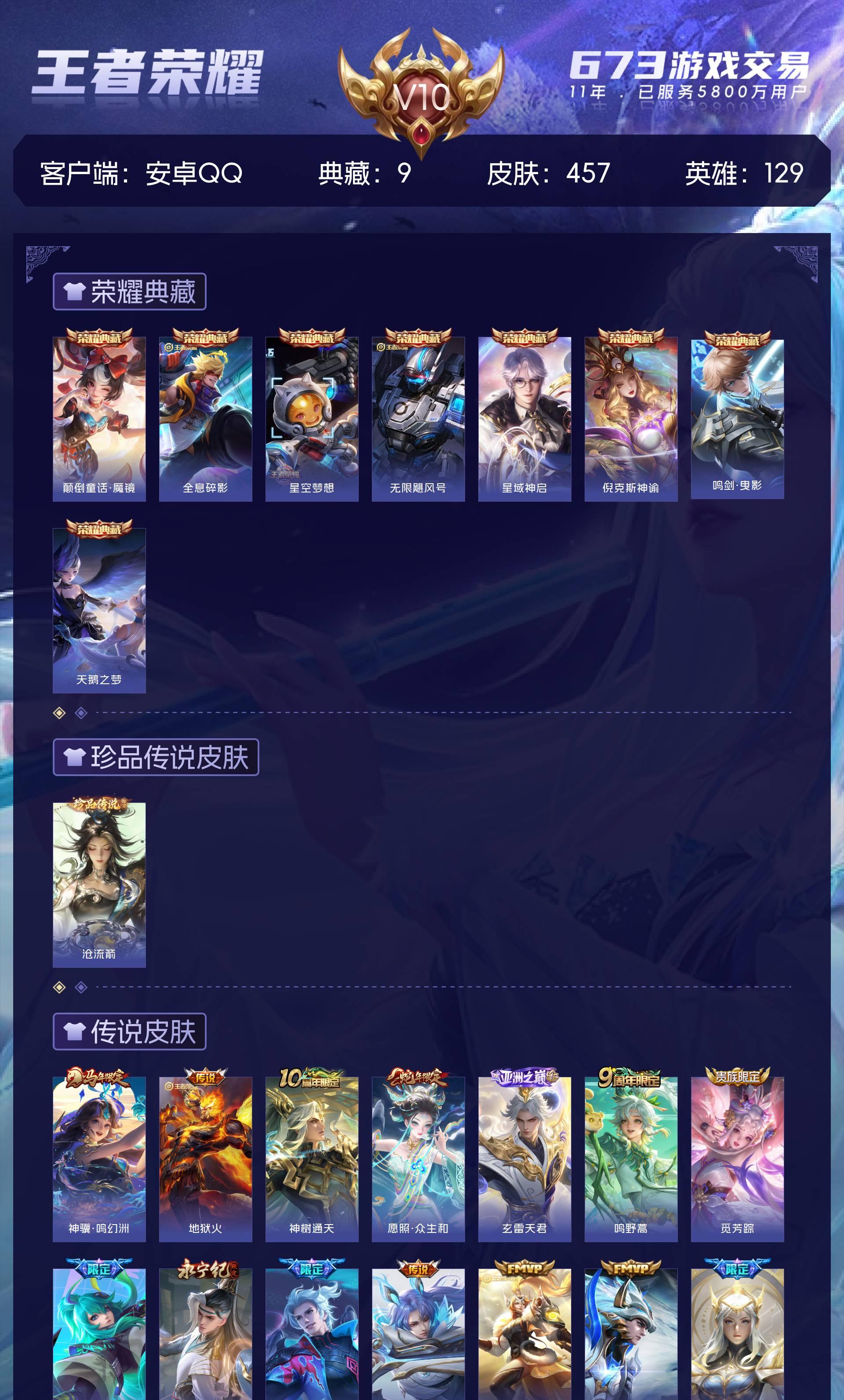 安卓QQ/绝世王者/457皮肤/129英雄/8典藏/0珍品无双/0无双/1珍品传说/51传说/136