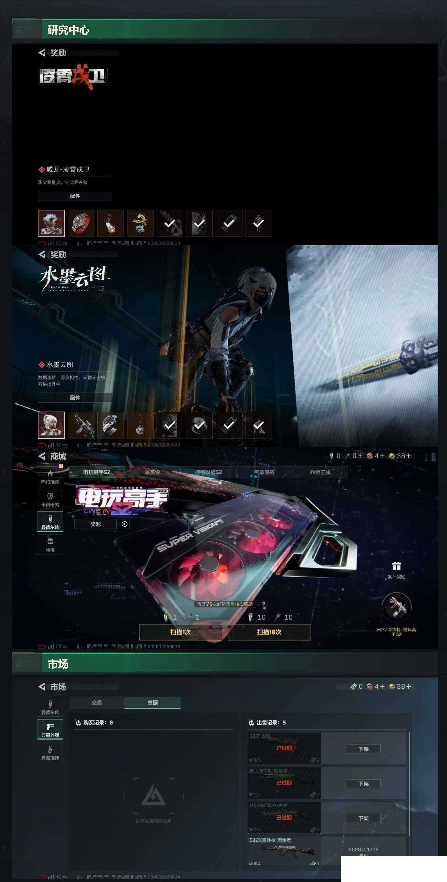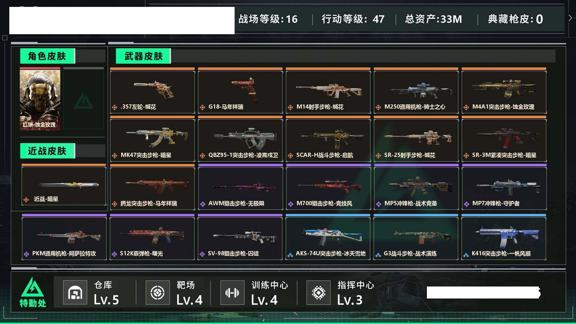 【sjs8842】红狼 暗星 烽火地带段位: 黄金 全面战场段位: 上等兵 总资产: 33000000 哈夫币: 7031000 sjs8842 干员外观: 红狼-蚀金玫瑰 传说武器皮肤: M4A1突击步枪-蚀金玫瑰,M250通用机枪-骑士之心,SCAR-H战斗步枪-启航,近战-暗星,MK47突击步枪-暗星,SR-3M紧凑突击步枪-暗星,QBZ95-1突击步枪-凌霄戍卫,腾龙突击步枪-马年祥瑞,G18-马年祥瑞,.357左轮-缄花,SR-25射手步枪-缄花,M14射手步枪-缄花 史诗武器皮肤: