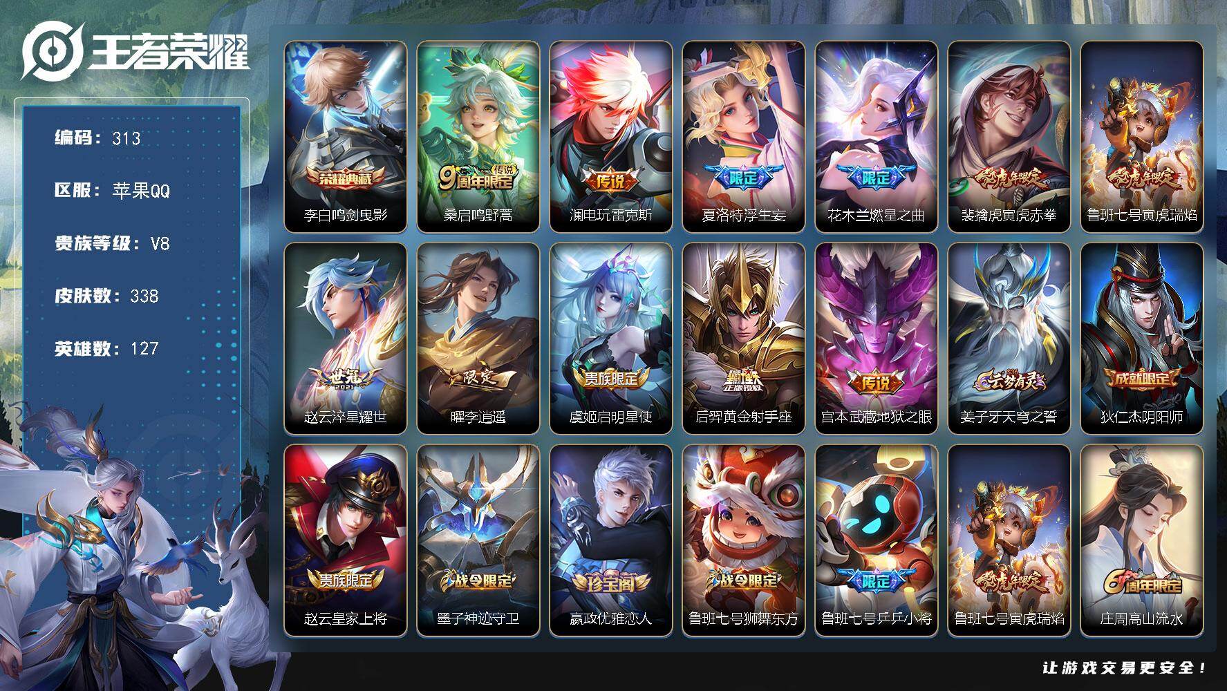 【编号09590 可秒换绑】【极品野王号带李白的荣耀典藏,裴擒虎的虎年限定,曜的李逍遥等等。!】苹果Q-V8-最强王者段位-127英雄-338皮肤-1典藏皮肤-11传说-104史诗【英雄全皮】:刘邦全皮,孙权全皮,猪八戒全皮,夏洛特全皮【荣耀典藏】:李白鸣剑曳影【传说皮肤】:桑启鸣野蒿,澜电玩雷克斯,夏洛特浮生妄,花木兰燃星之曲,裴擒虎寅虎赤拳,鲁班七号寅虎瑞焰,赵云淬星耀世,曜李逍遥 ,虞姬启明星使,后羿黄金射手座,宫本武藏地狱之眼【限定皮肤】:姜子牙天穹之誓,狄仁杰阴阳师,赵云皇家上将,墨子