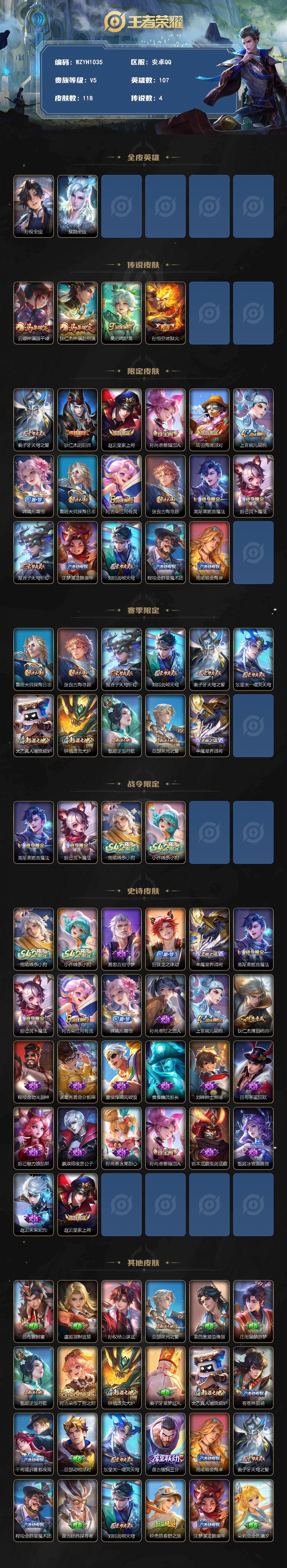 【WZYH1035】贵族5/皮肤118/传说4/史诗24/英雄107/孙权全皮/敖隐全皮/云缨神骥越千峰/狄仁杰神骥赴朔漠/桑启-鸣野蒿/孙悟空-地狱火/姜子牙-天穹之誓/狄仁杰-阴阳师/赵云-皇家上将/孙尚香-蔷薇恋人/项羽-海滩派对/上官婉儿-梁祝/嫦娥-拒霜思/鲁班大师-探海日志/阿古朵-江河有灵/张良-古海寻踪/高渐离-燃音魔法/妲己-灵卜魔法/鬼谷子-天穹祈灯/沈梦溪-龙舞盛年/刘邦-剑破天穹/程咬金-群星魔术团/周瑜-熔金海岸/东皇太一噬灭天穹/太乙真人谧流熔炉/钟馗虚灵犬护/甄姬逆