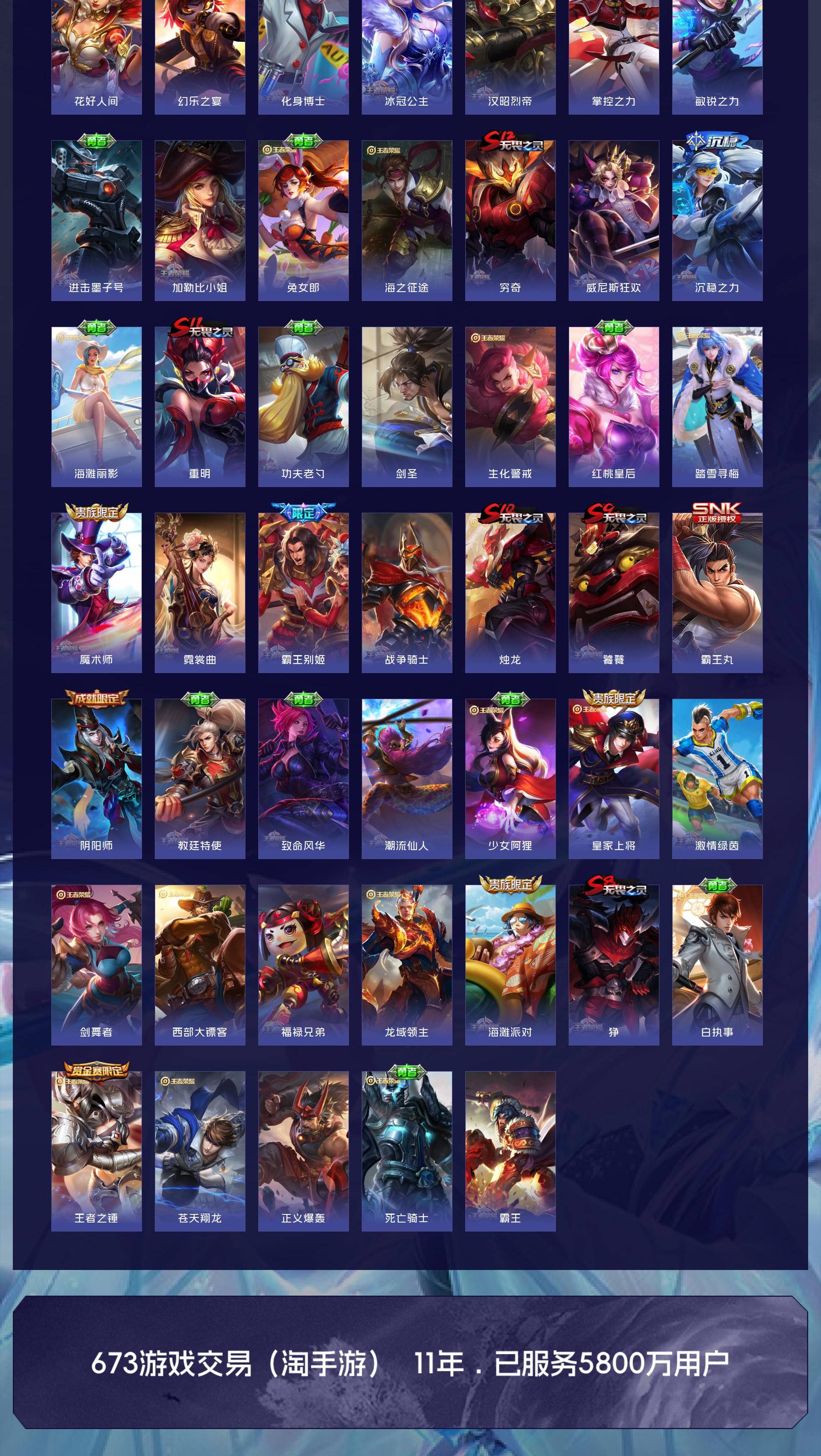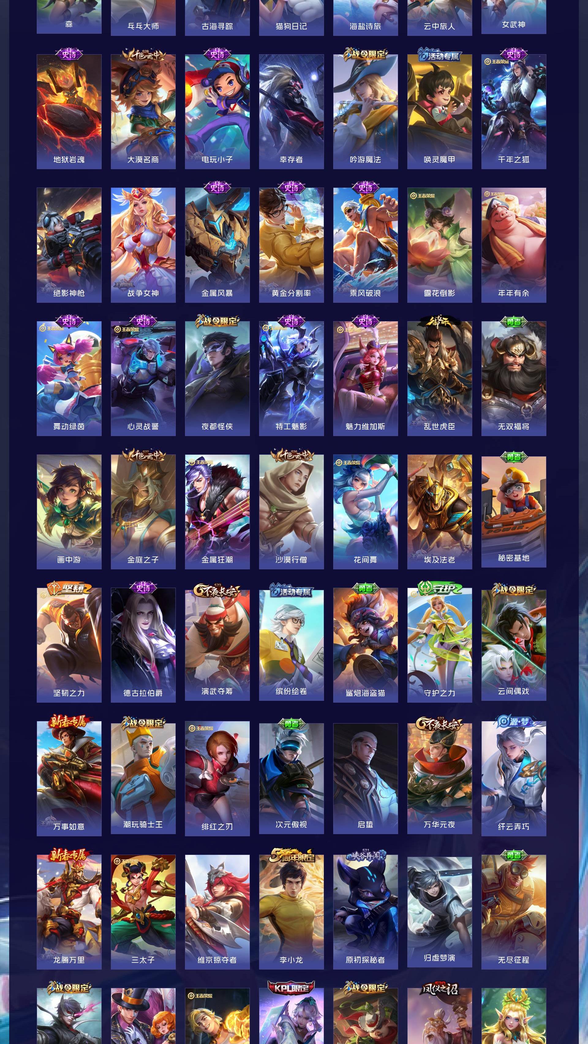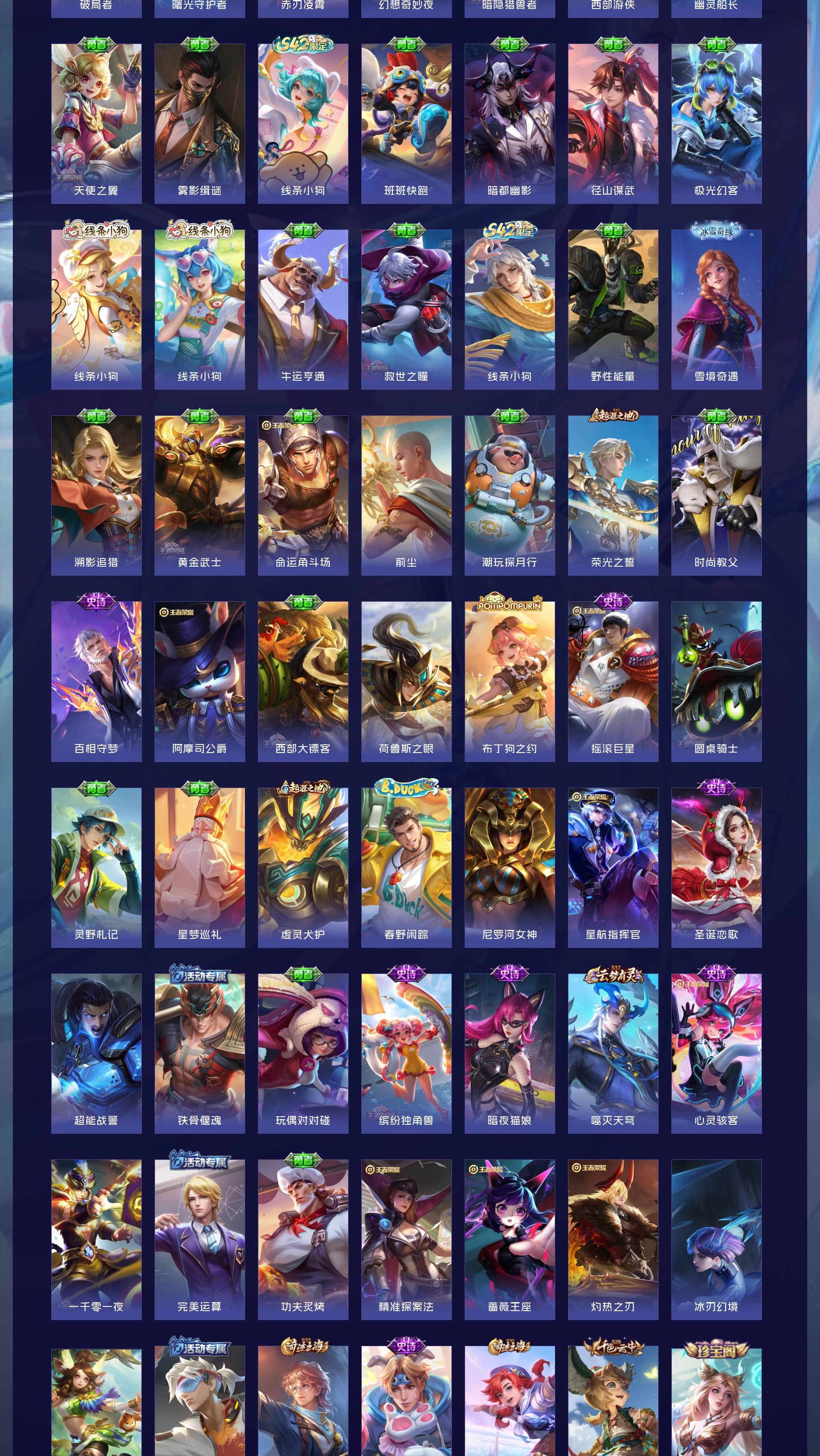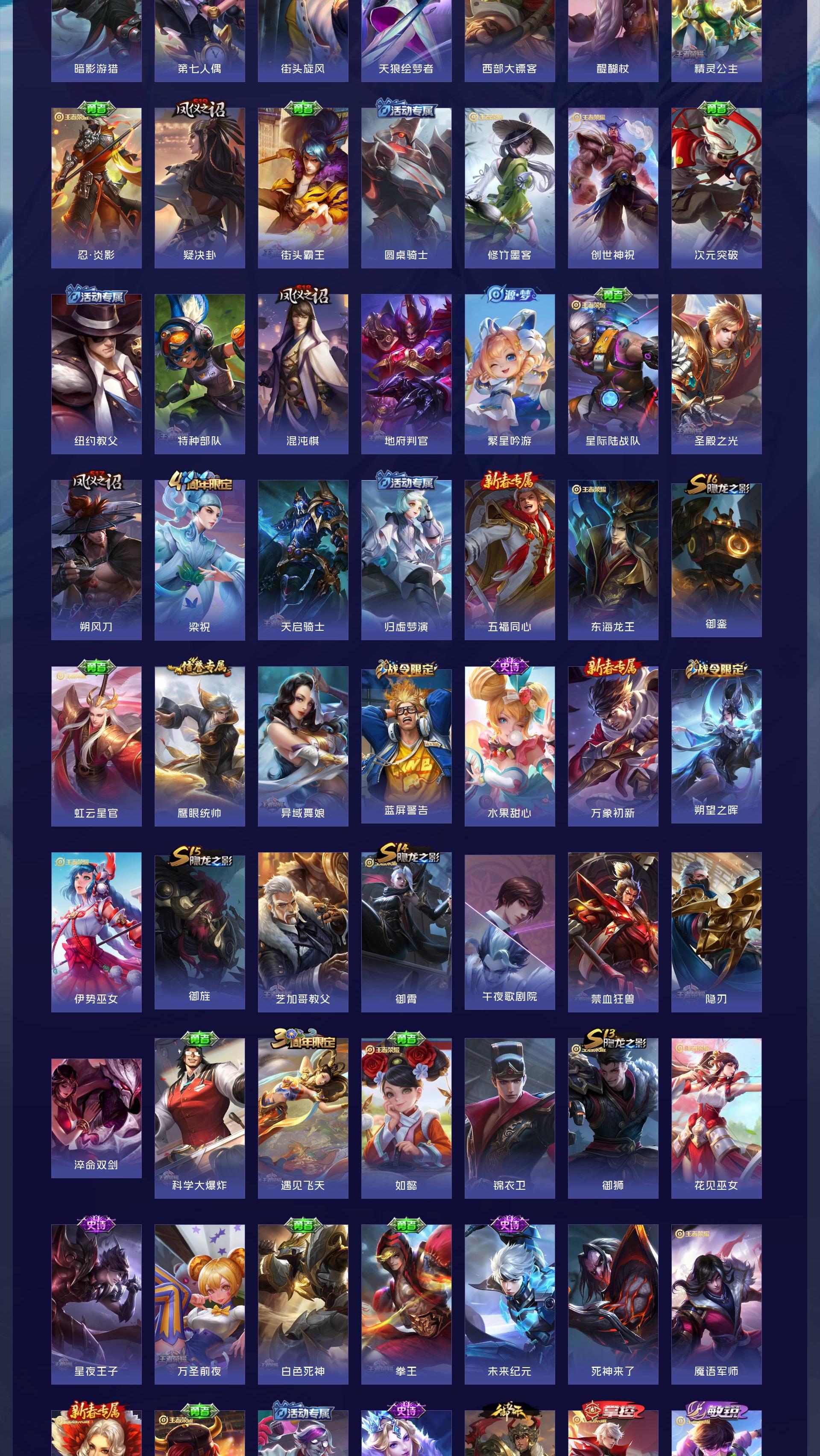 【传说皮肤】鸣野蒿 超时空战士 地狱之眼 黄金射手座 一念神魔 末日机甲 地狱火 永曜之星 云霓雀翎 启明星使 淬星耀世 天魔缭乱【史诗皮肤】线条小狗 百相守梦 完美运算 舞动绿茵 幽灵船长 繁星吟游 魅力维加斯 魔术师 鹰眼统帅 蓝屏警告 圣诞恋歌 曙光守护者 暗隐猎兽者 千年之狐 地狱岩魂 德古拉伯爵 电玩小子 暗影游猎 金属风暴 梁祝 李小龙 天狼绘梦者 猫狗日记 水果甜心 乘风破浪