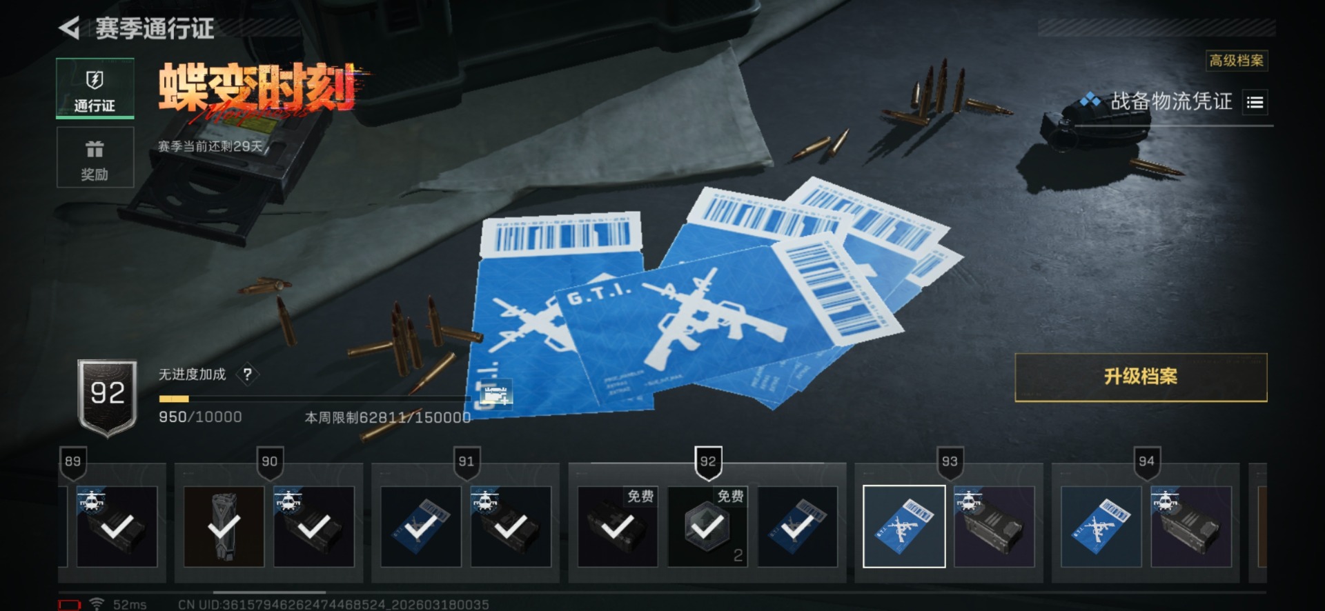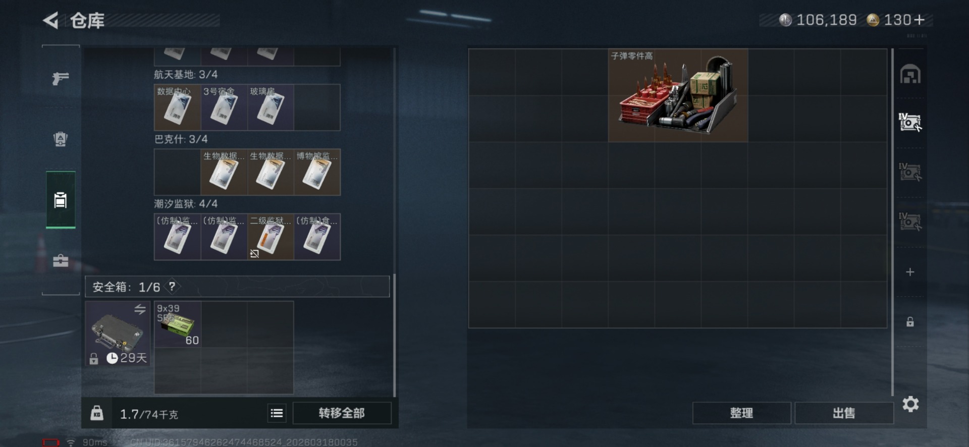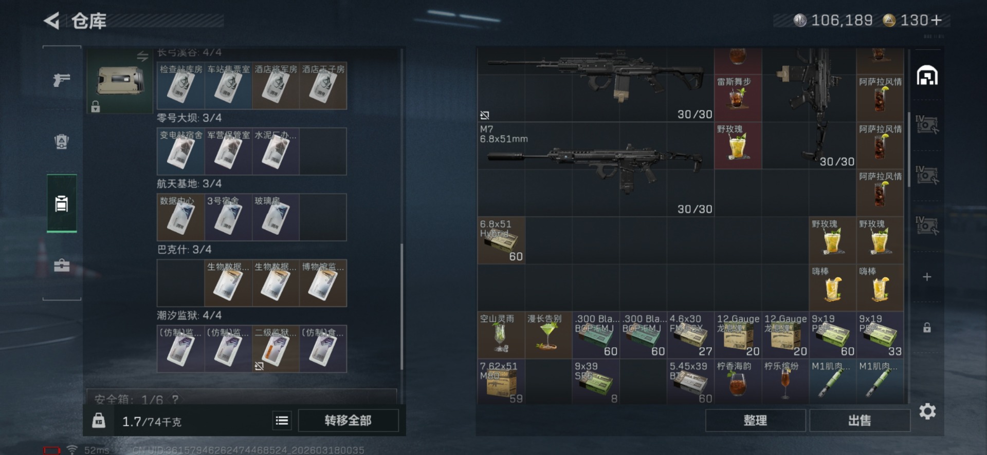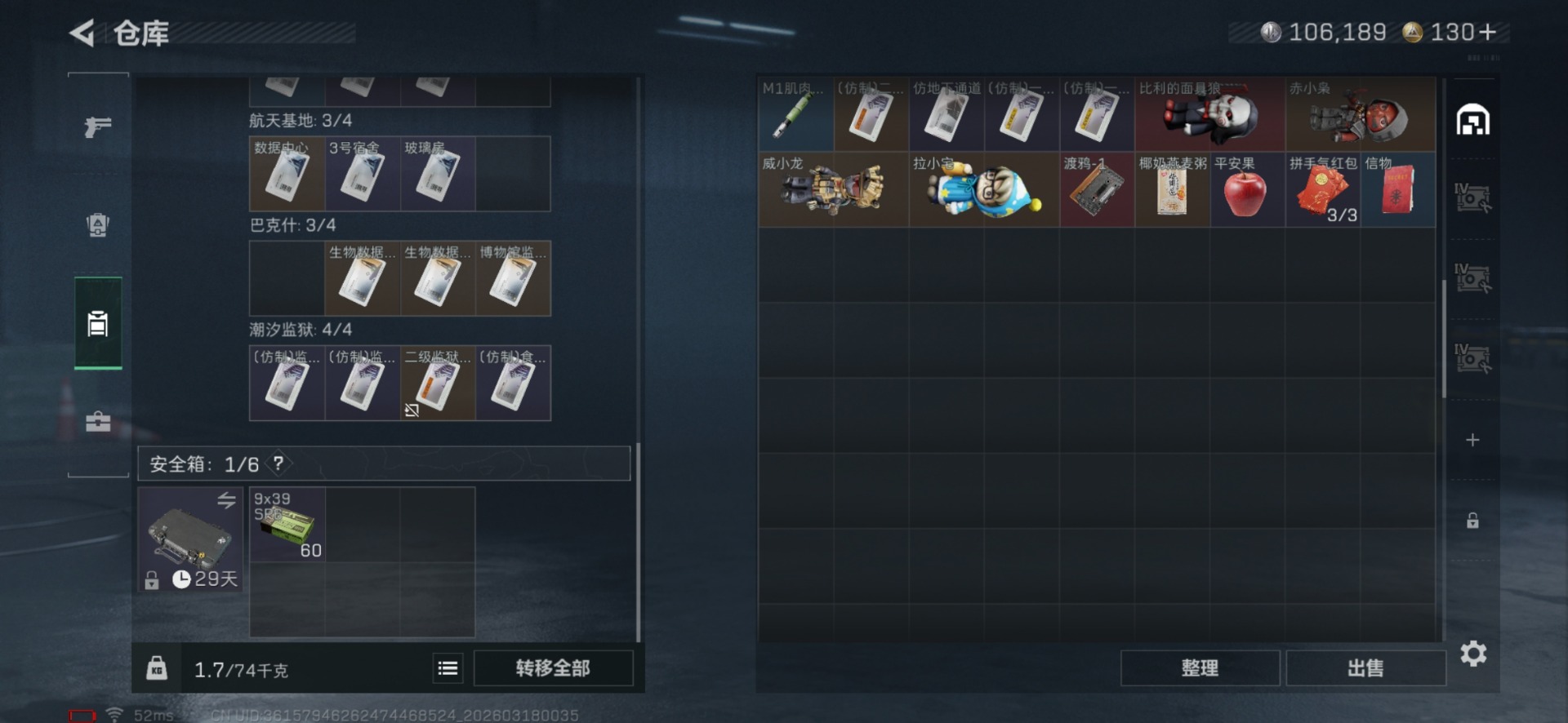 [17813887]总资产:63.1M 2干员外观 1近战传说 26传说枪械 哈夫币:106.189K 不可修改实名