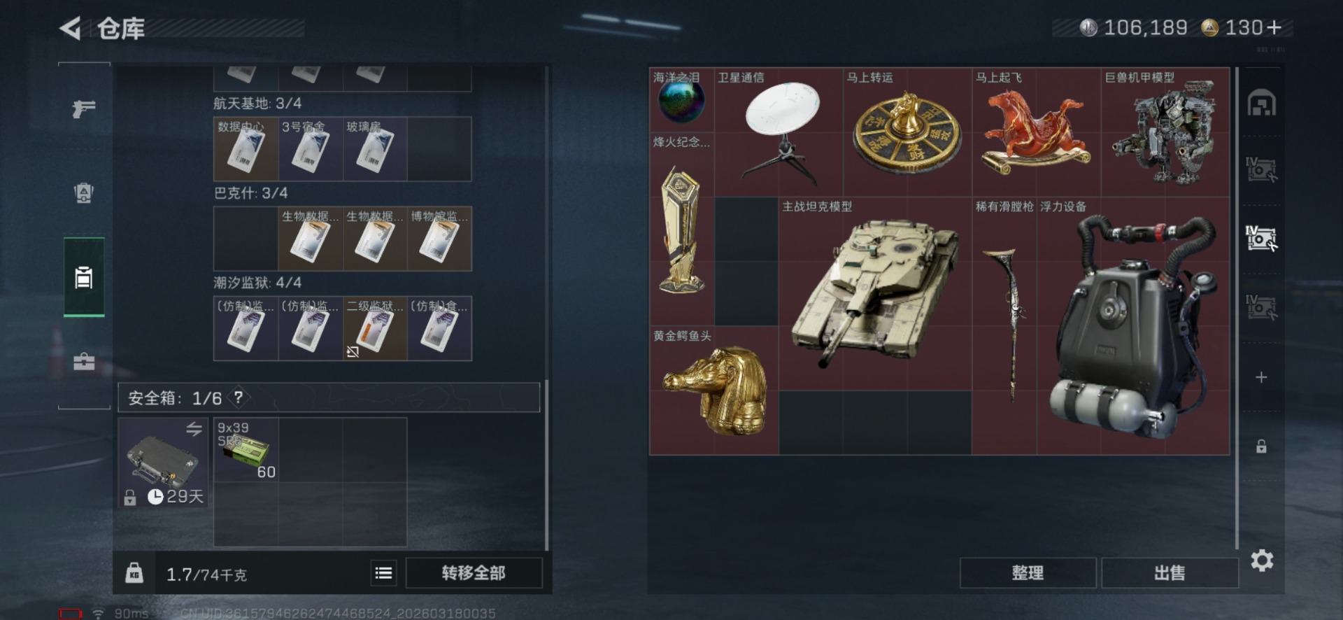 总资产:63.1M 2干员外观 1近战传说 26传说枪械 哈夫币:106.189K