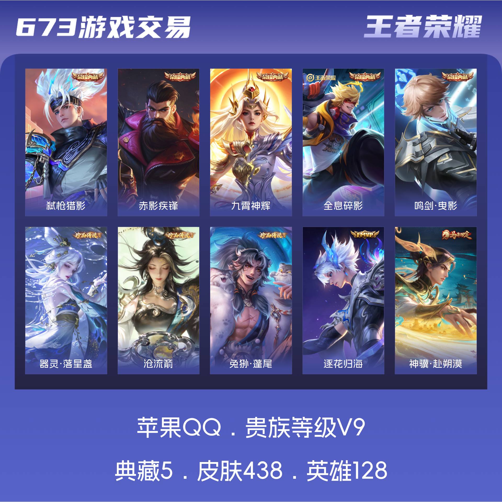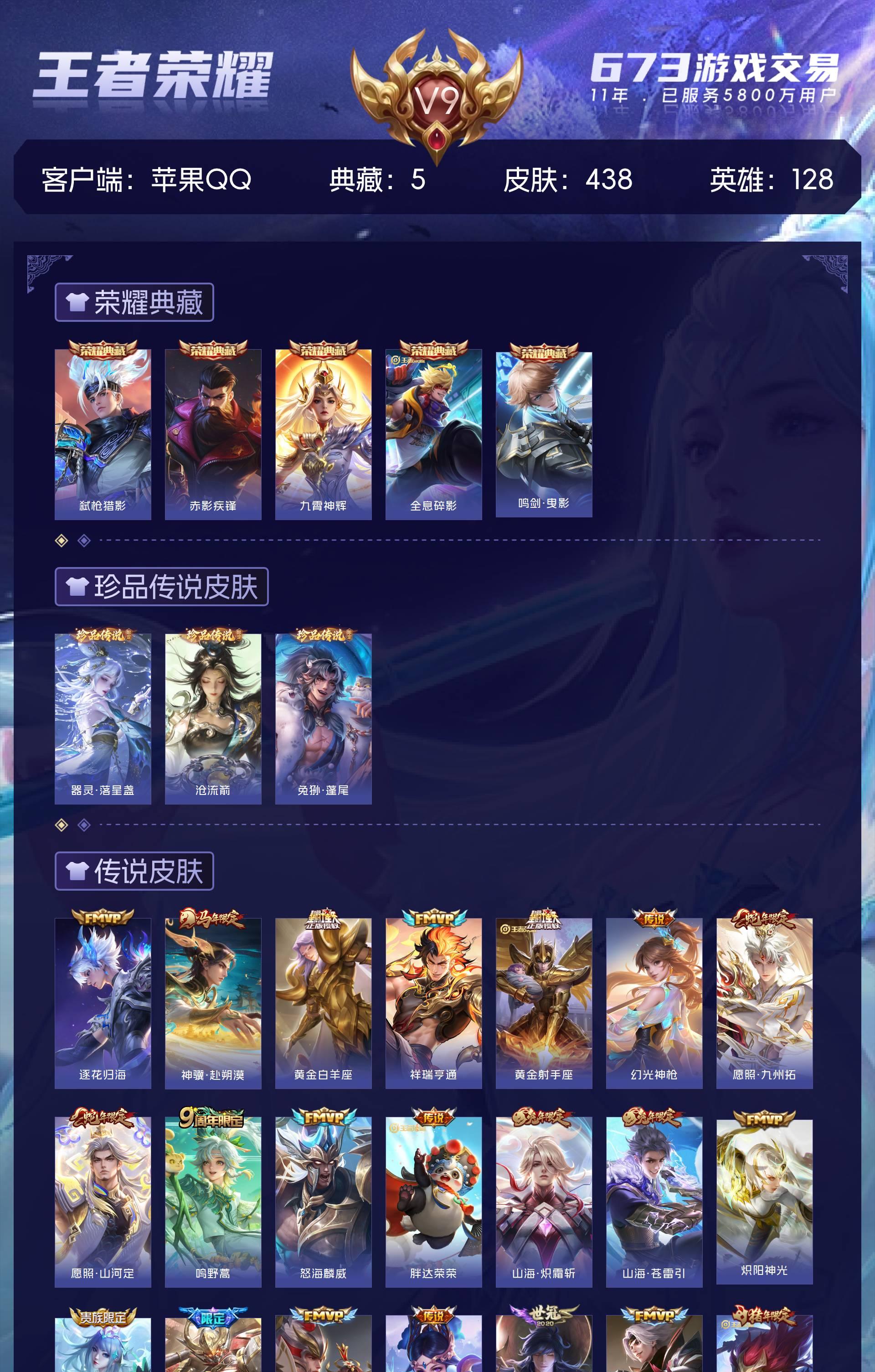 苹果QQ/无双王者/438皮肤/128英雄/5典藏/0珍品无双/0无双/3珍品传说/38传说/133