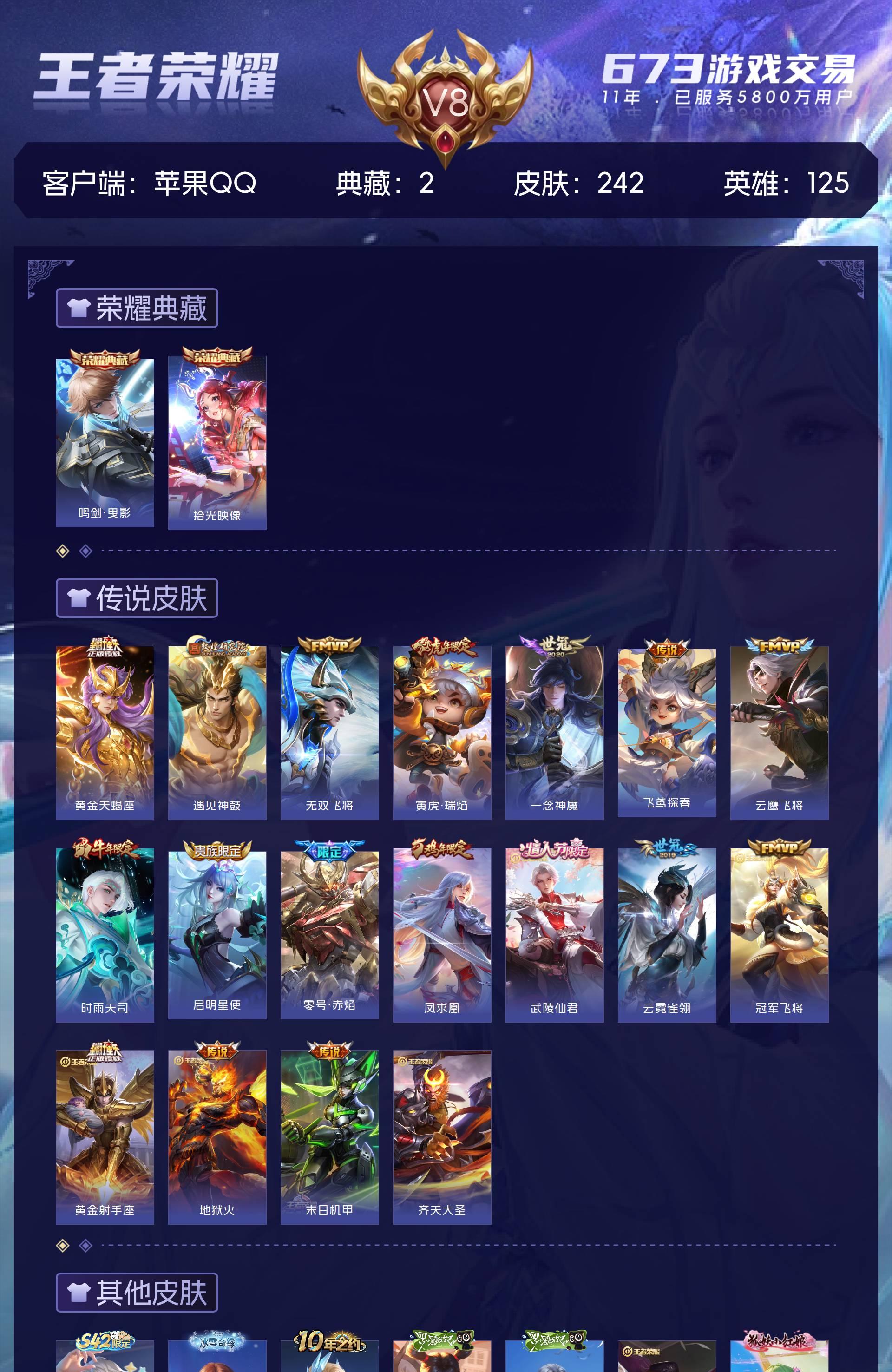 苹果QQ/尊贵铂金/242皮肤/125英雄/2典藏/0珍品无双/0无双/0珍品传说/18传说/75史
