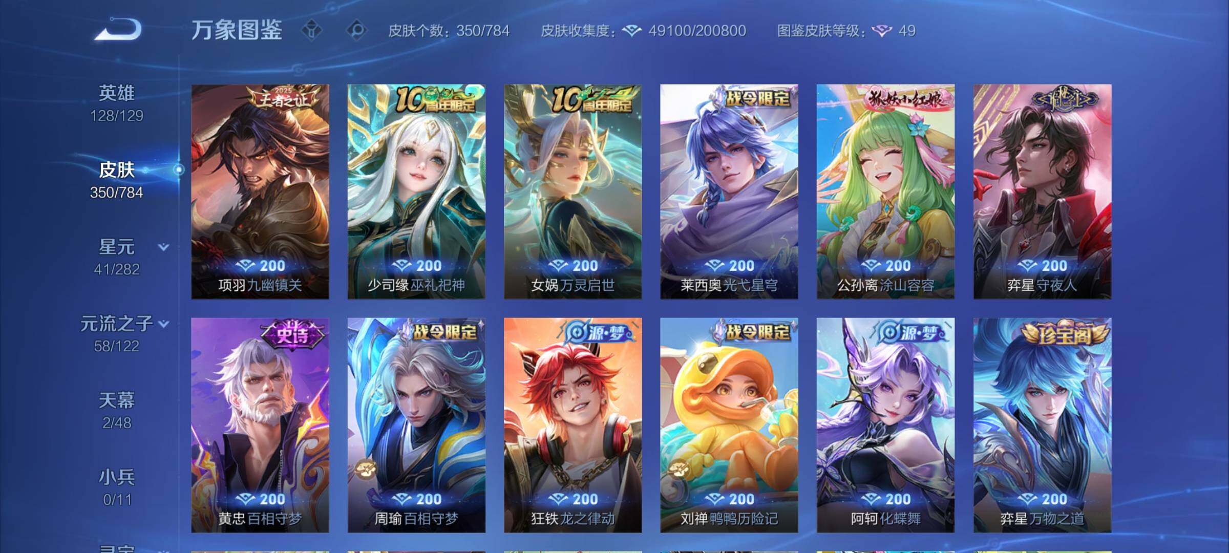 可二次 V8-350皮肤-1典藏皮肤-22传说-95史诗【英雄全皮】:刘禅全皮,孙权全皮,狂铁全皮【星元皮肤】:鲁班七号寅虎焰心,宫本武藏幽冥之眼【天幕】:凤鸣九霄天幕(钱包无法注销介意勿拍)