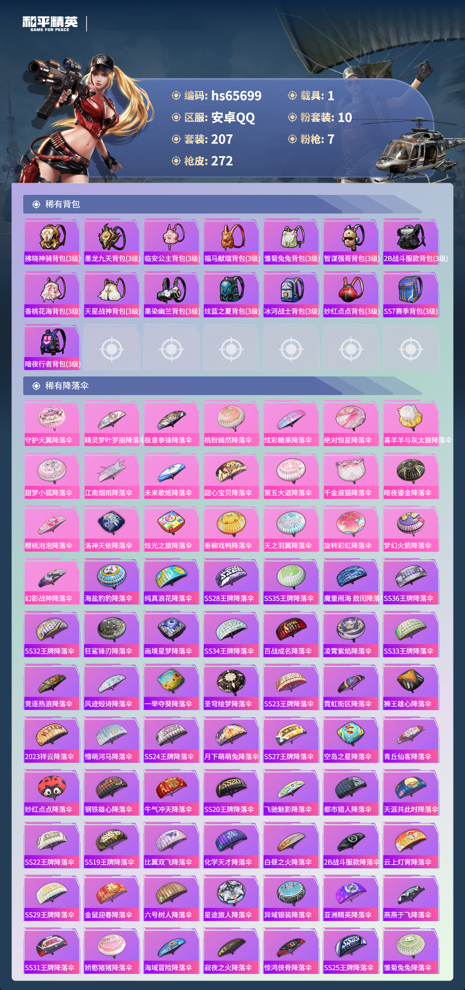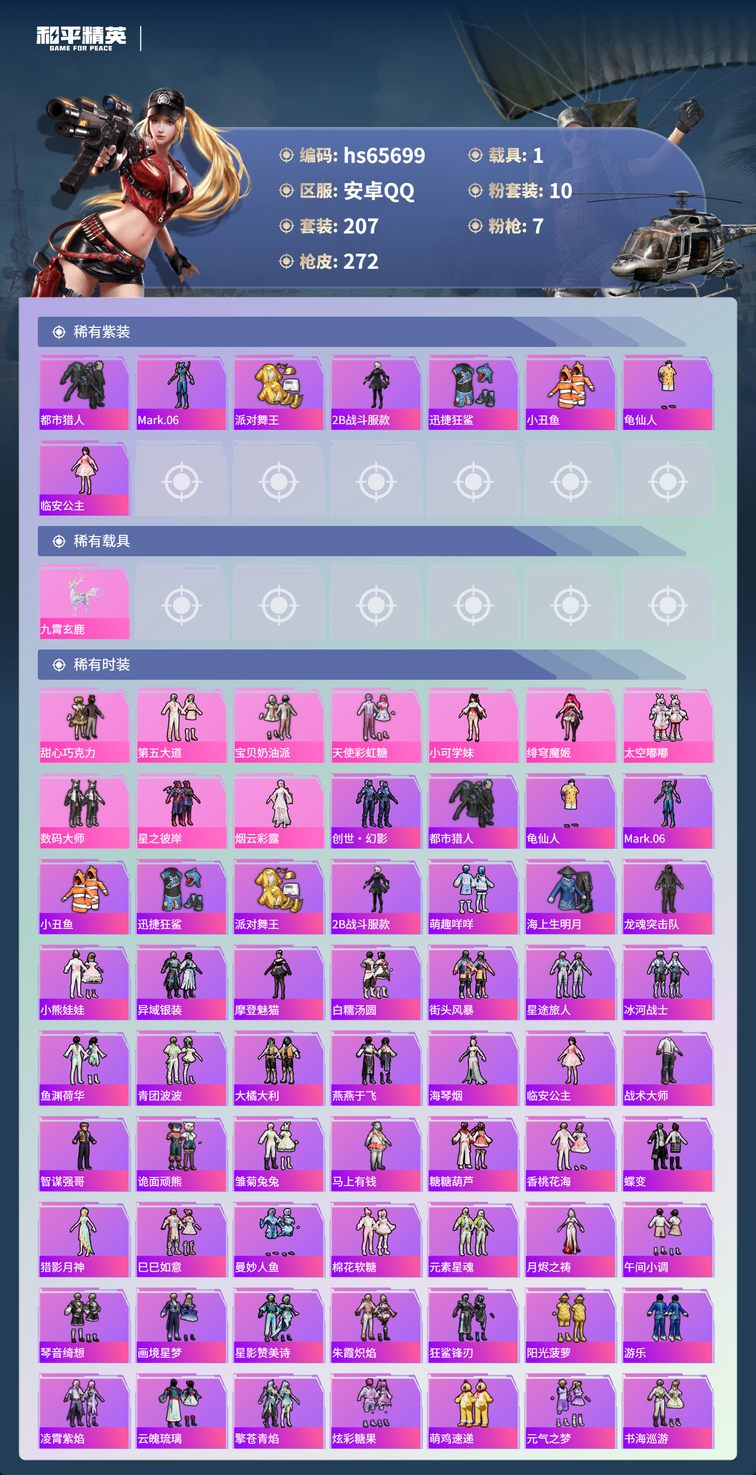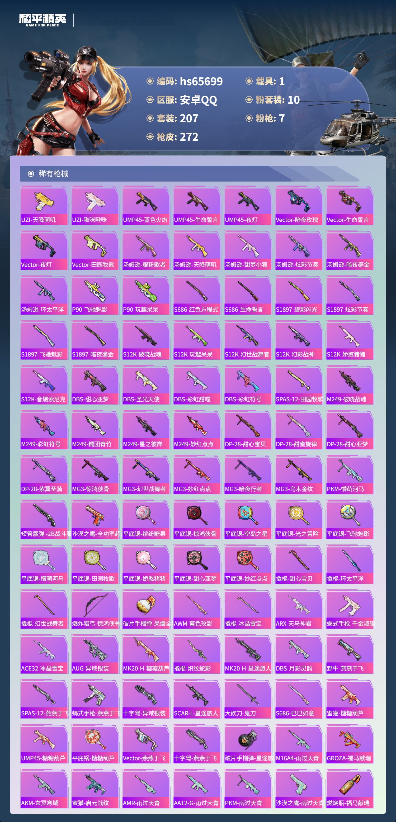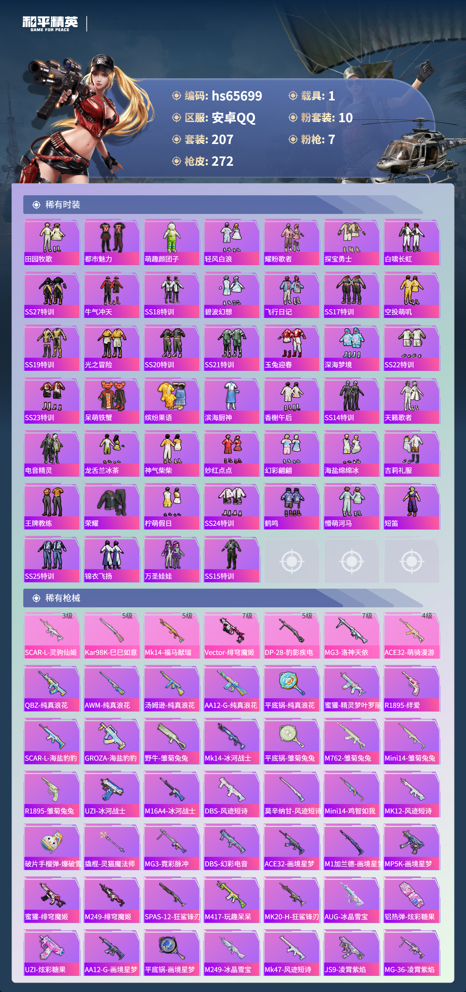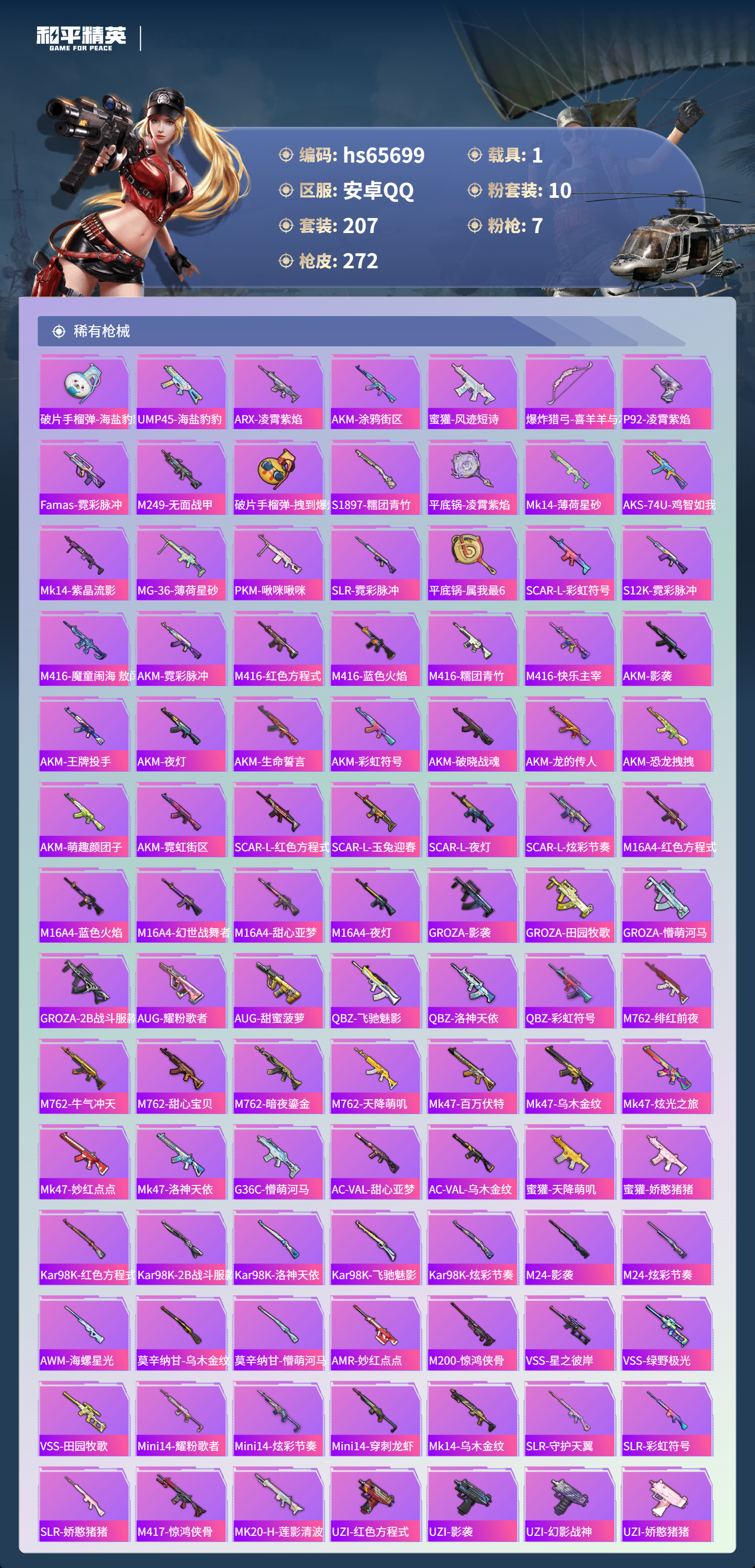 hs65699 安卓手Q-19王牌印记-10粉装-7特效枪-1载具-89619热力值-207套装-272枪皮-1卓越印记