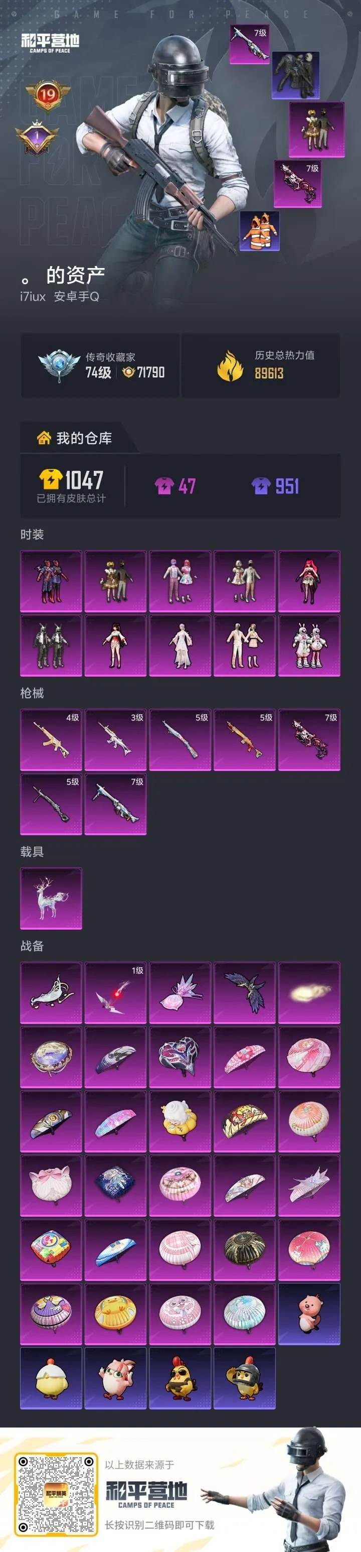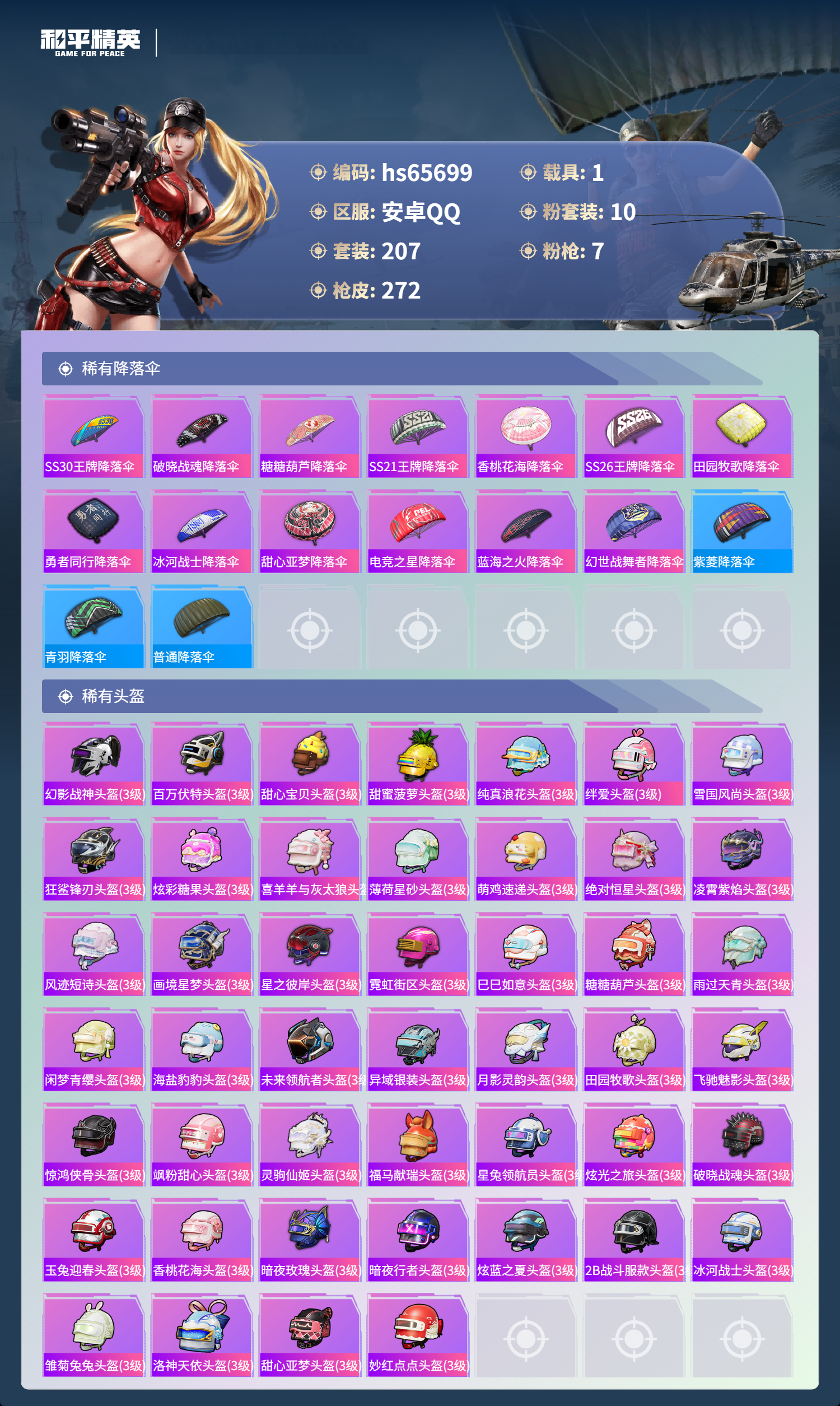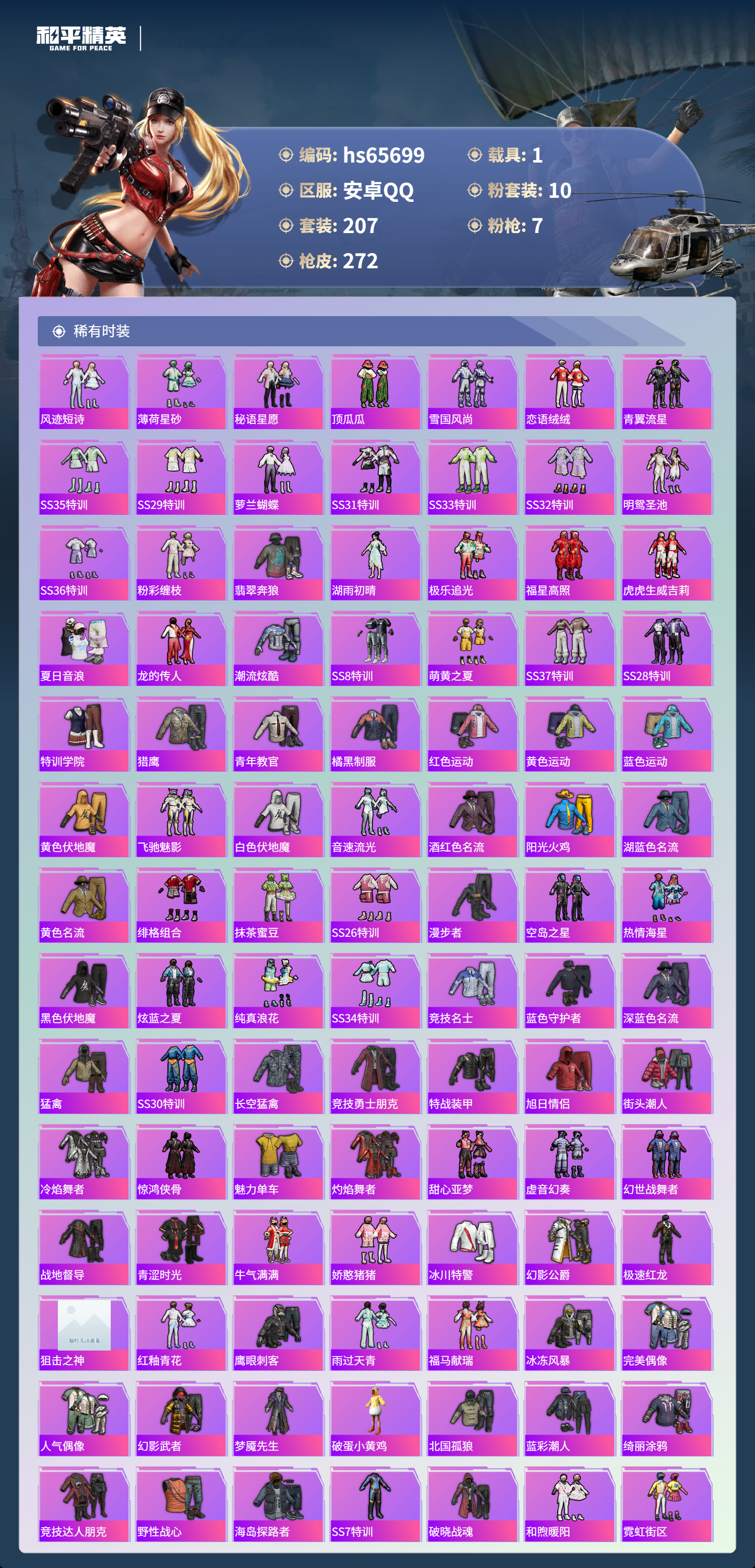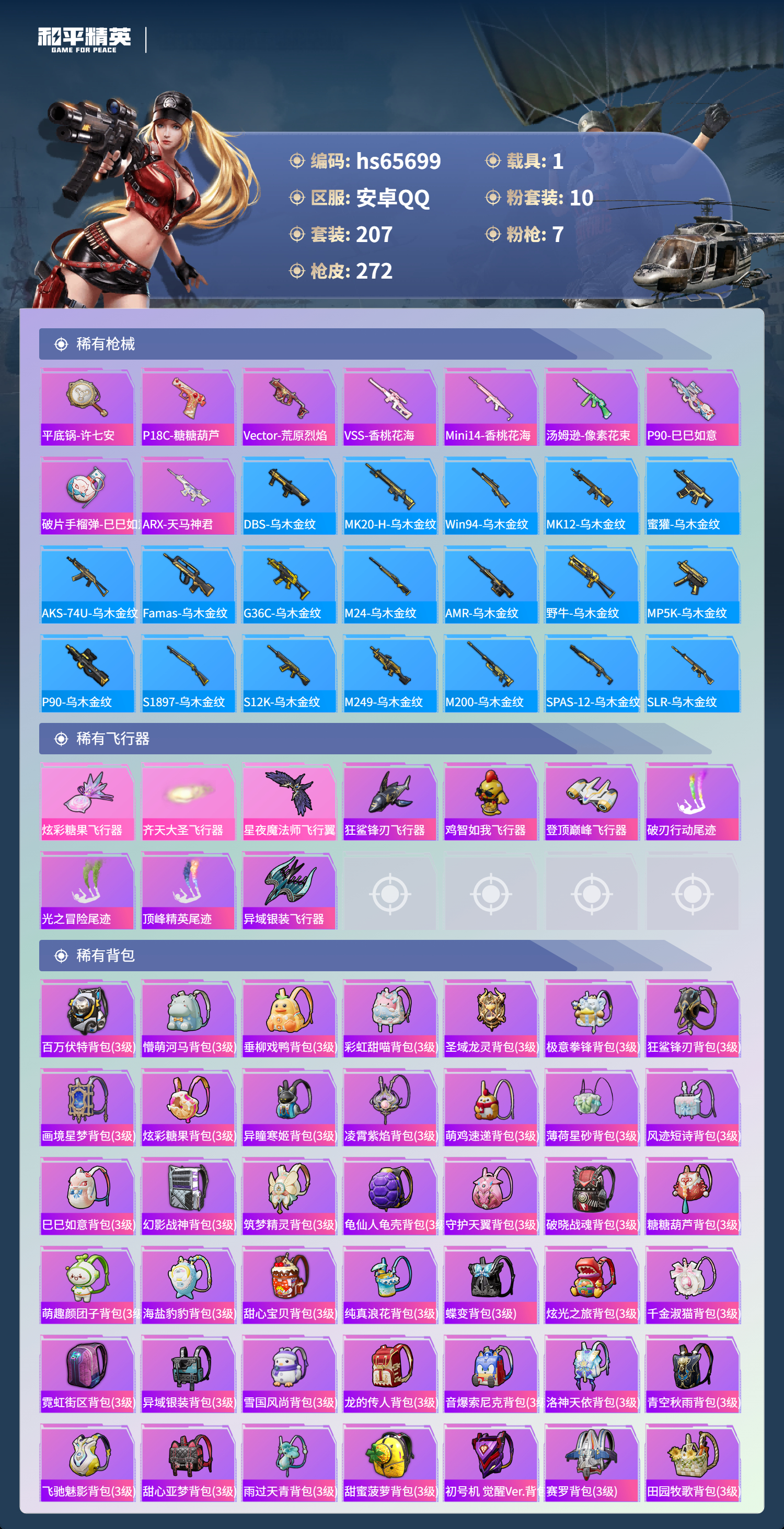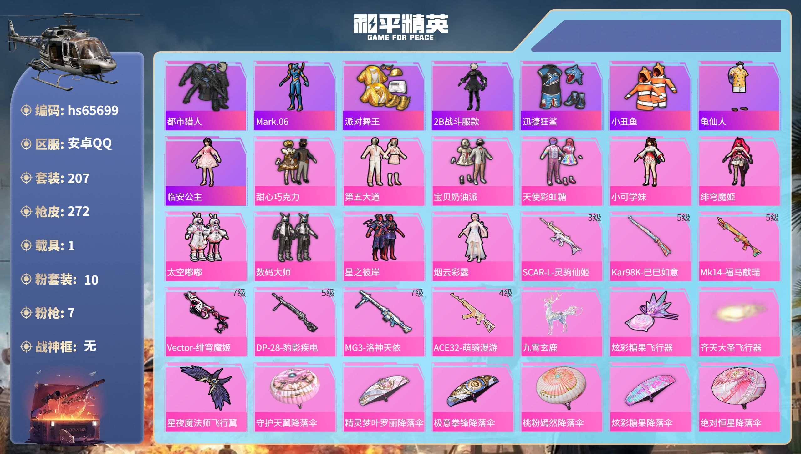 hs65699 安卓手Q-19王牌印记-10粉装-7特效枪-1载具-89619热力值-207套装-272枪皮-1卓越印记