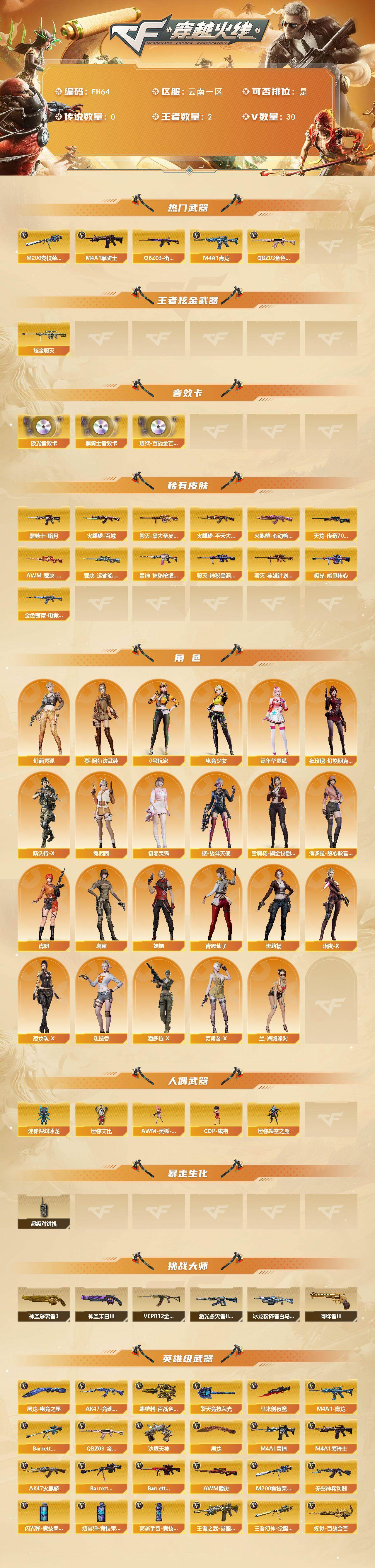 云南一区-35V-2王者武器数-1炫金武器数【热门武器】:QBZ03-金色蔷薇,M4A1-青龙,M200-竞技荣光,QBZ03-街机,M4A1-黑骑士【王者炫金武器】:炫金毁灭【音效卡】:M4A1-黑骑士音效卡,Barrett-极光音效卡,炼狱-百战金芒-庆典舞曲音效卡【皮肤】:金色蔷薇-电竞之星 皮肤,AWM-裁决-凤灵皮肤,裁决-运输船 皮肤,雷神-神秘按键 皮肤,火麒麟-平天大圣,火麒麟-百城,火麒麟-心动糖果,毁灭-黑大圣皮肤,毁灭-神秘黑洞皮肤,毁灭-英雄计划 皮肤,黑骑士-暗月,AW