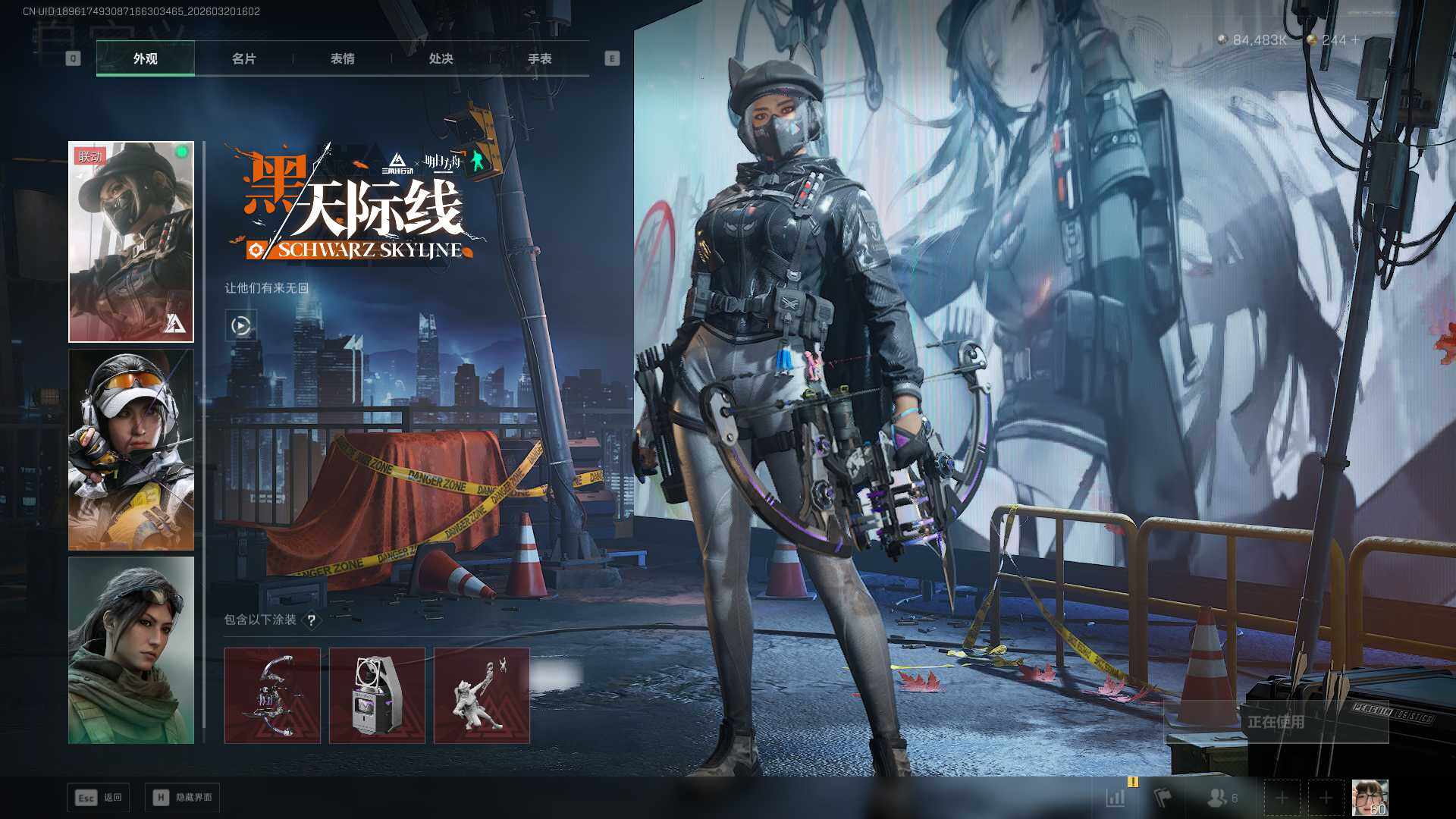 【干员外观】:红狼-蚀金玫瑰,露娜-黑·天际线,蜂医-送葬人·无题密令,深蓝-不破誓约,红狼-电锯惊魂,露娜-金牌射手,乌鲁鲁-荒原猎手