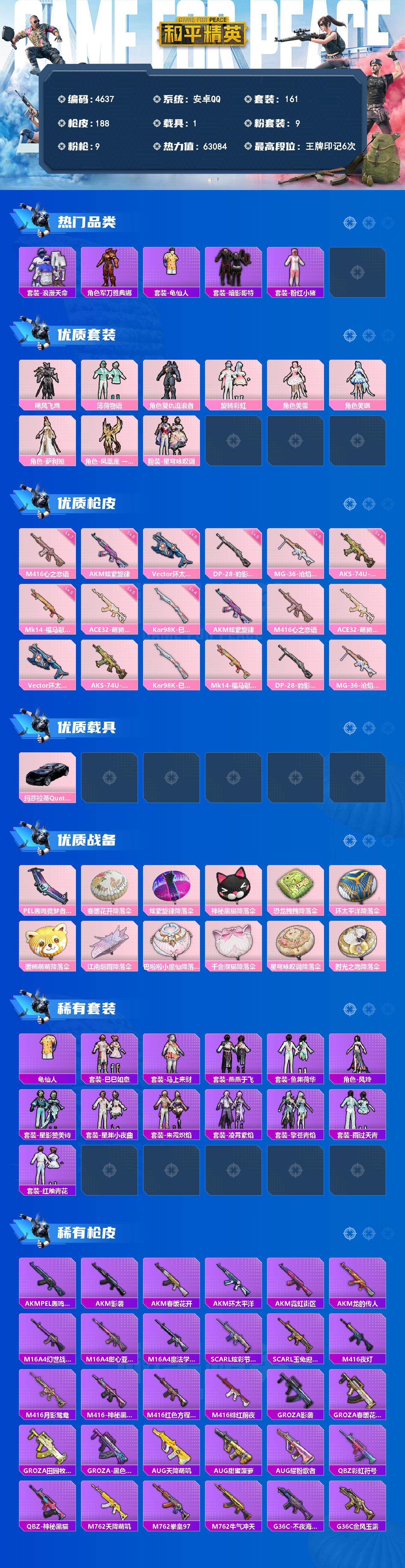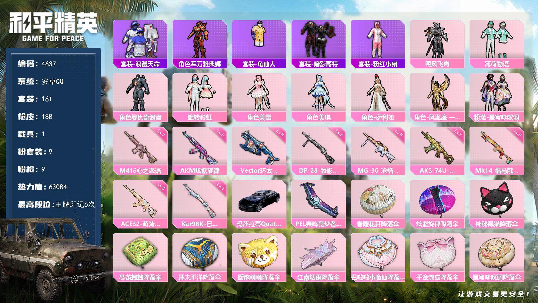 眼罩安卓 手Q-9粉装-9特效枪-1载具-1粉色飞行器-63084热力值-6王牌印记-161套装-188枪皮