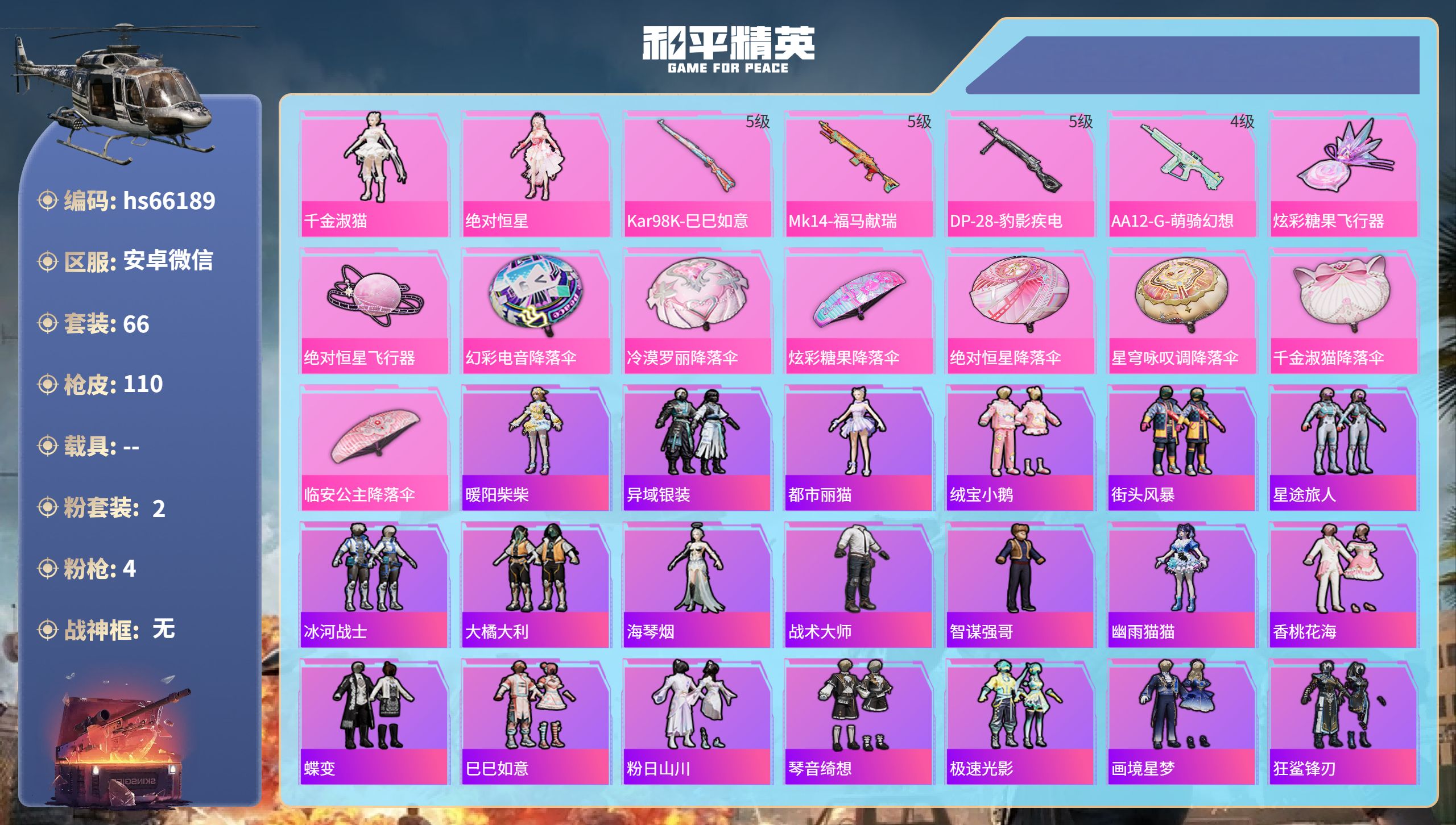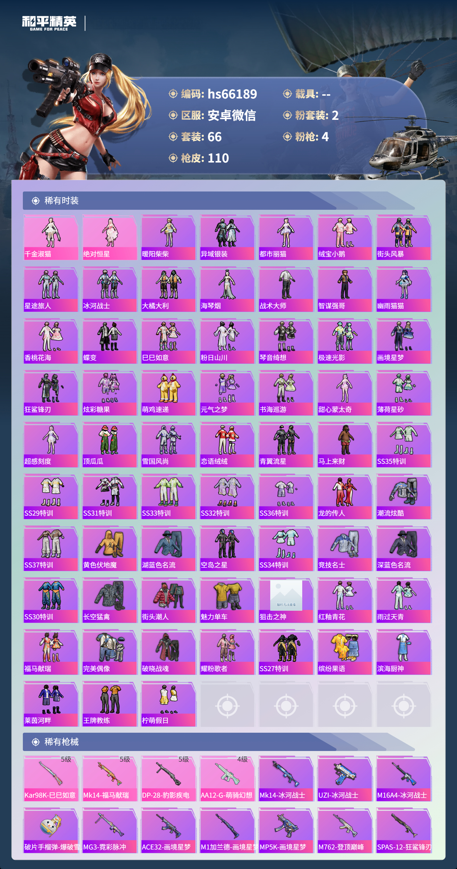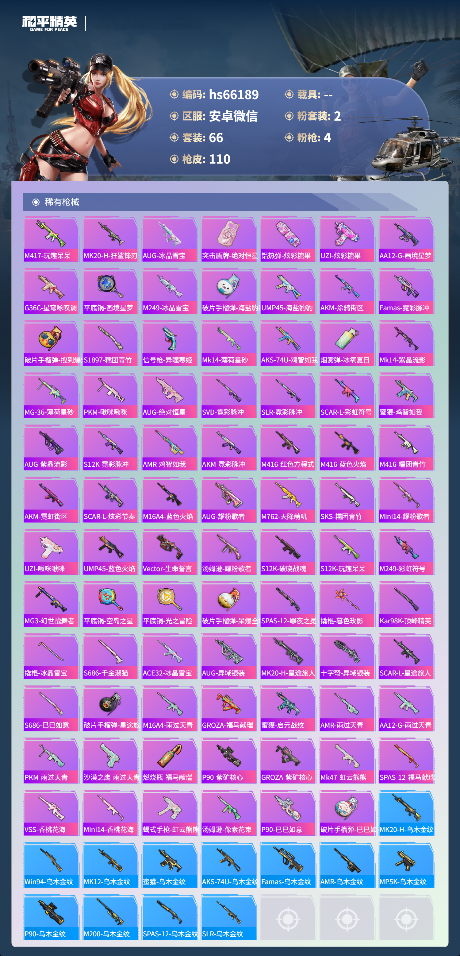hs66189 安卓微信-2王牌印记-2粉装-4特效枪-28722热力值-66套装-110枪皮-1卓越印记