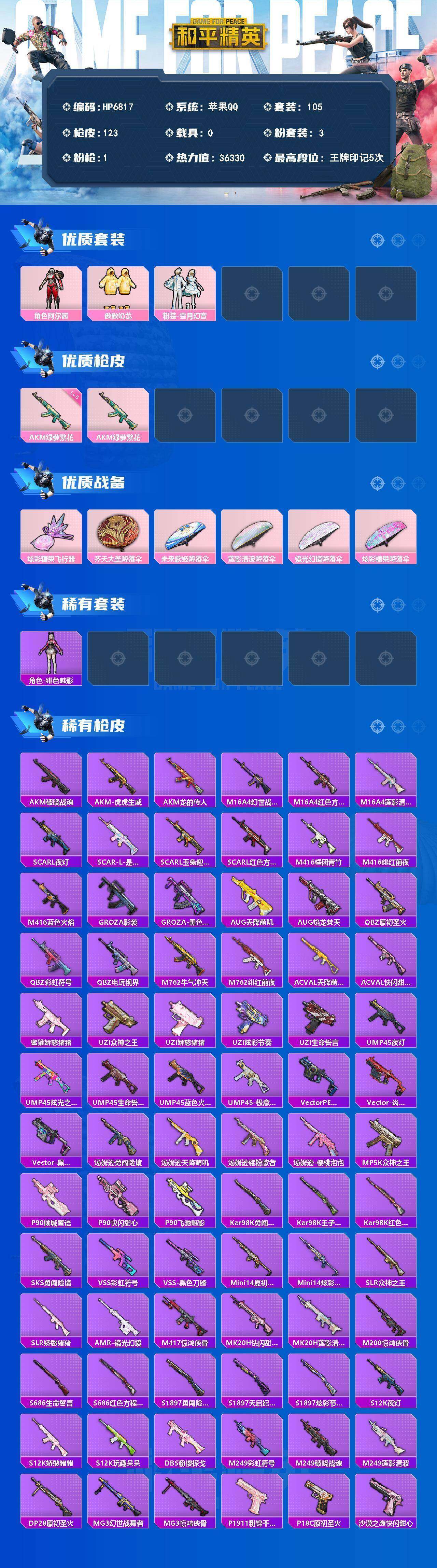 (3粉套1粉枪)角色-阿尔茜/粉装-傲傲奶龙/粉装-雪月幻音/AKM绿萝繁花五级/没战神框/HP6817-1粉色飞行器-36330热力值-5王牌印记-105套装-123枪皮
