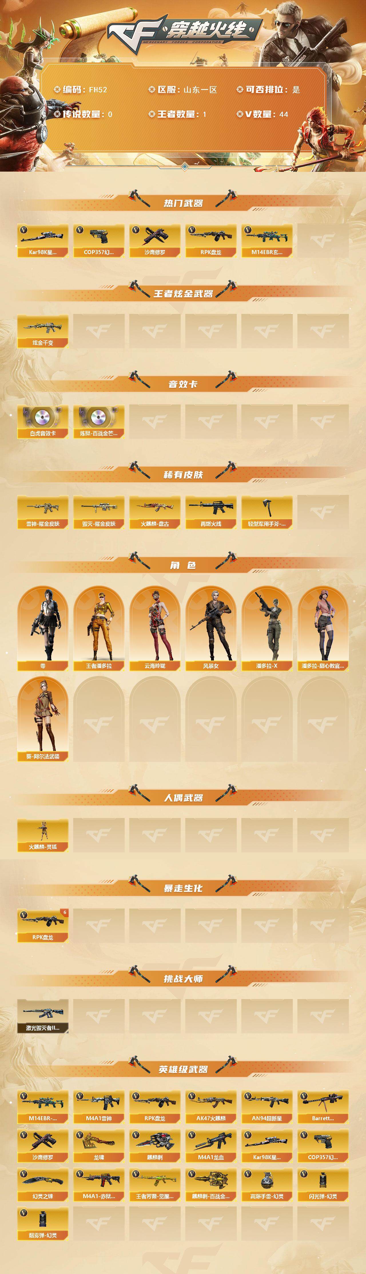山东一区-47V-1王者武器数-1炫金武器数【热门武器】:M14EBR-玄武,Kar98K-星神,RPK-盘龙*6,COP 357-幻灵*2,沙鹰-修罗*4【王者炫金武器】:炫金千变【音效卡】:Scar Light-白虎音效卡,炼狱-百战金芒-庆典舞曲音效卡【皮肤】:雷神-耀金皮肤,M4A1-再燃火线,火麒麟-盘古,毁灭耀金皮肤,轻型军用手斧-再燃火线【角色】:零,王者潘多拉,云海玲珑,葵-阿尔法武装,风暴女,潘多拉-X,潘多拉-甜心教官【人偶武器】:火麒麟-灵狐【挑战大师】:激光毁灭者III-