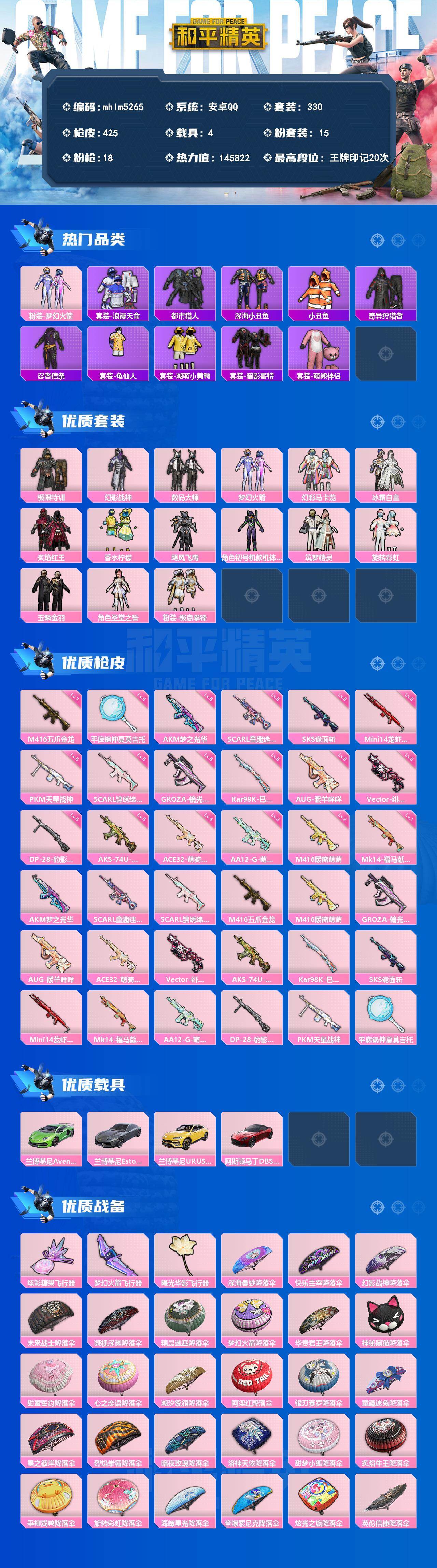安卓 手Q-15粉装-18特效枪-4载具-3粉色飞行器-145822热力值-20王牌印记-330套装-425枪皮