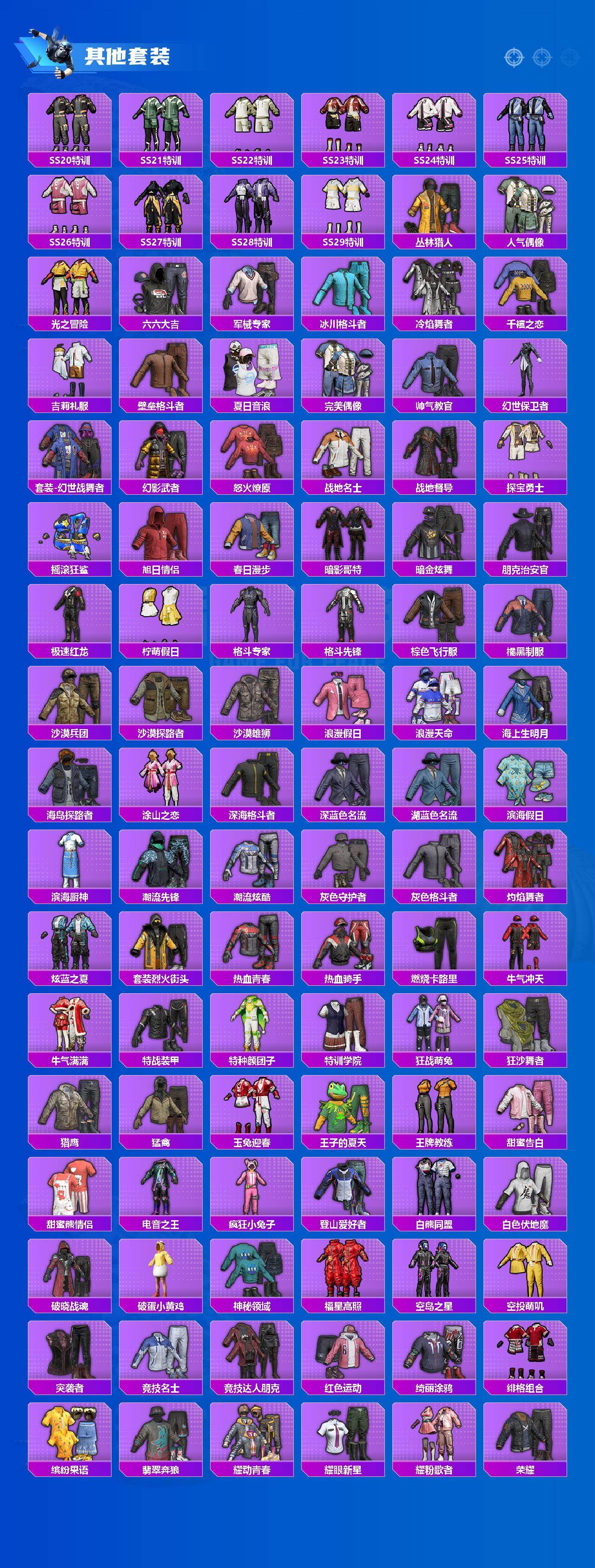 【粉色套装】:粉装-极限特训,粉装-幻影战神,粉装-数码大师,粉装-梦幻火箭,粉装-幻彩马卡龙,粉装-冰霜白皇,粉装-炙焰红王,粉装-香水柠檬,粉装-飓风飞鹰,角色-初号机款机体服,粉装-筑梦精