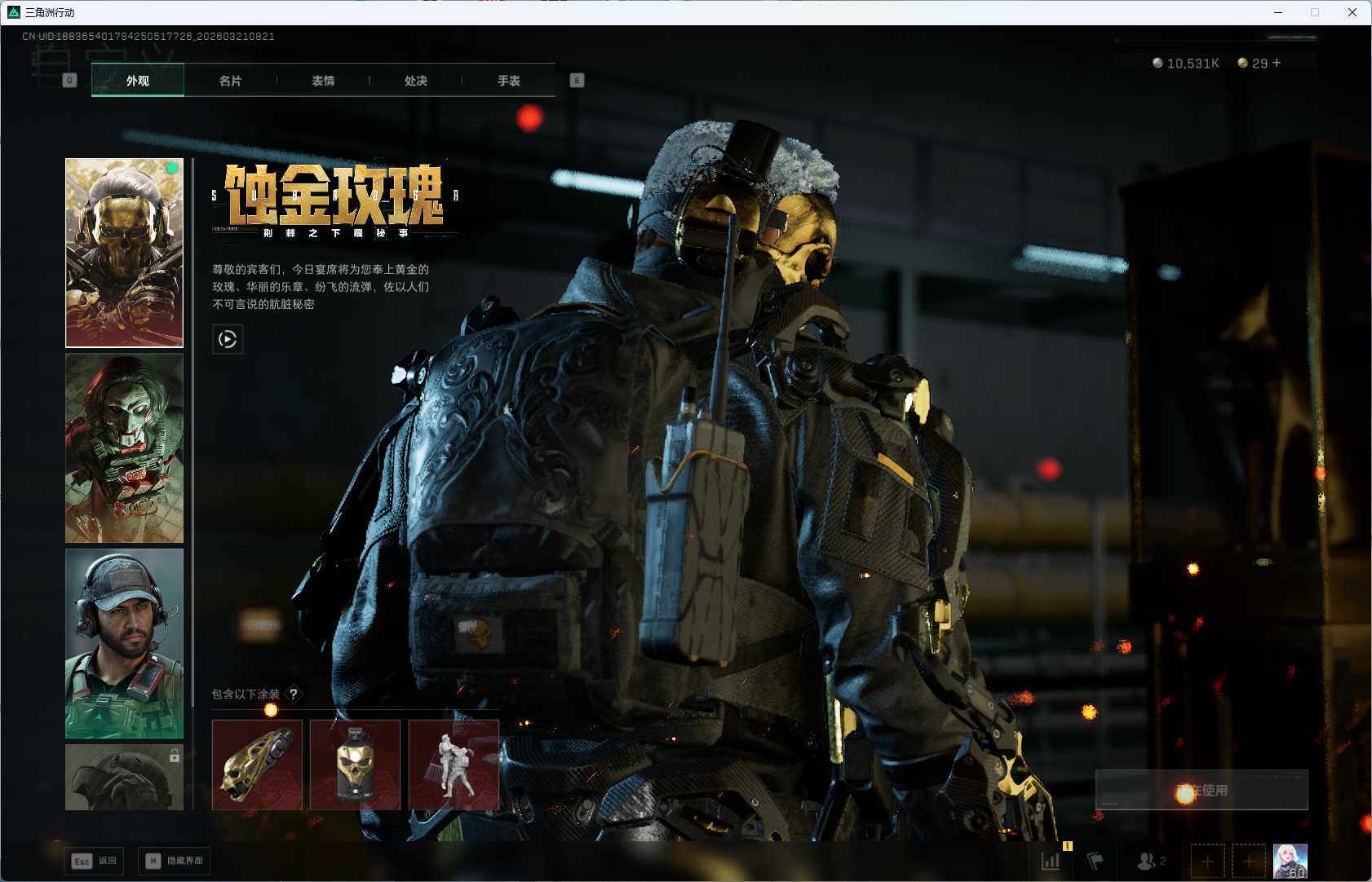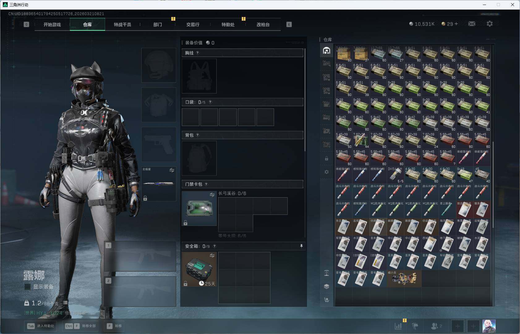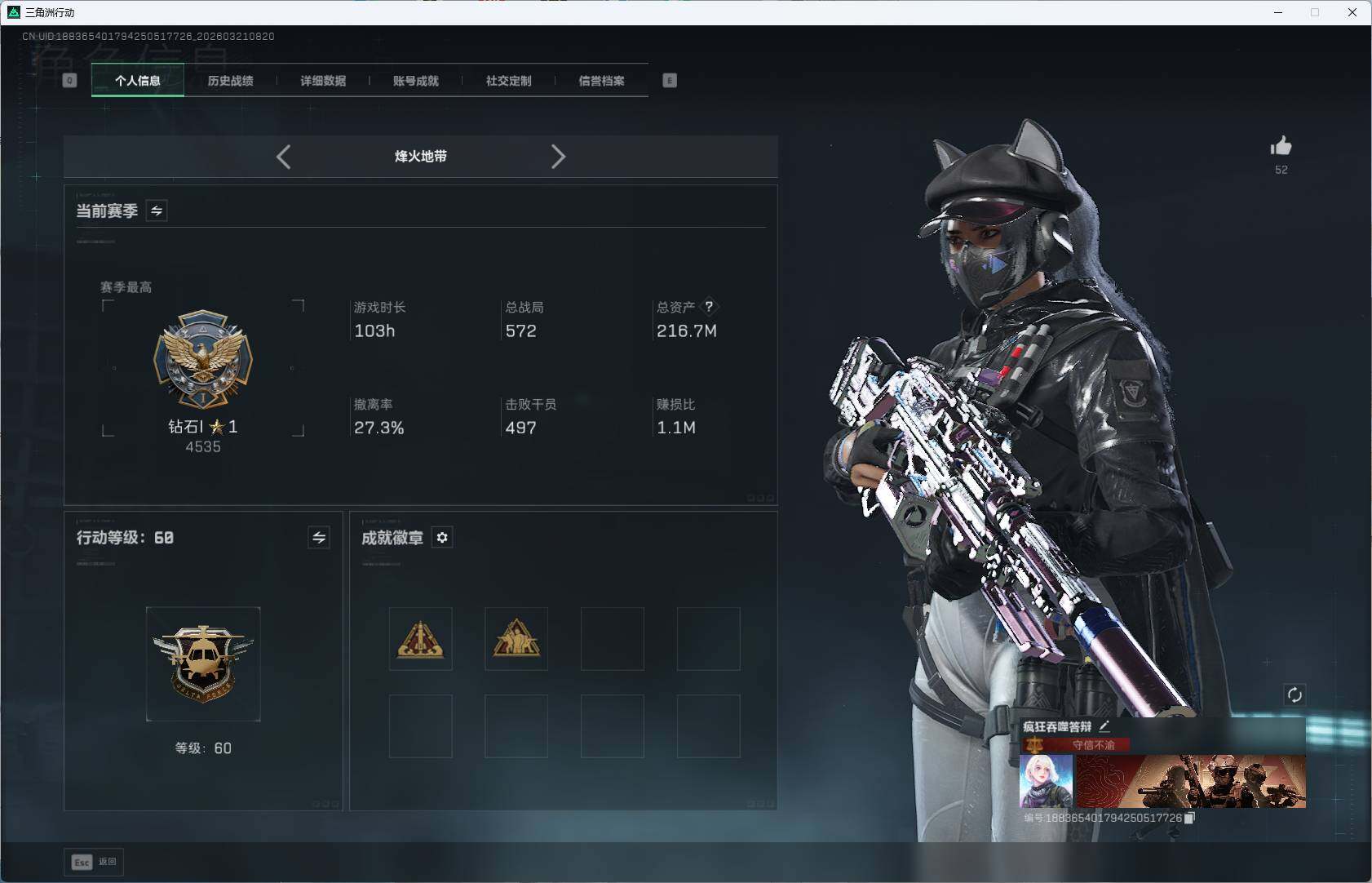 总资产(M):216M/哈夫币(K):10531K/传说枪皮数:47/全面战场等级:50_段位:上等兵/烽火地带等级:60_段位:钻石/