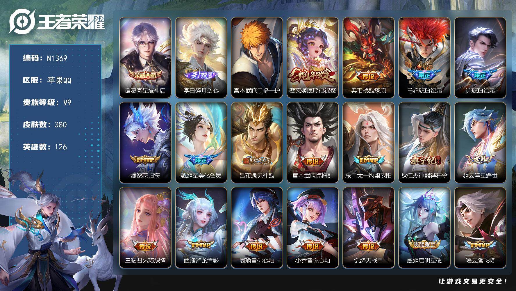 苹果Q-V4-最强王者段位-126英雄-380皮肤-1典藏皮肤-1无双-1珍品传