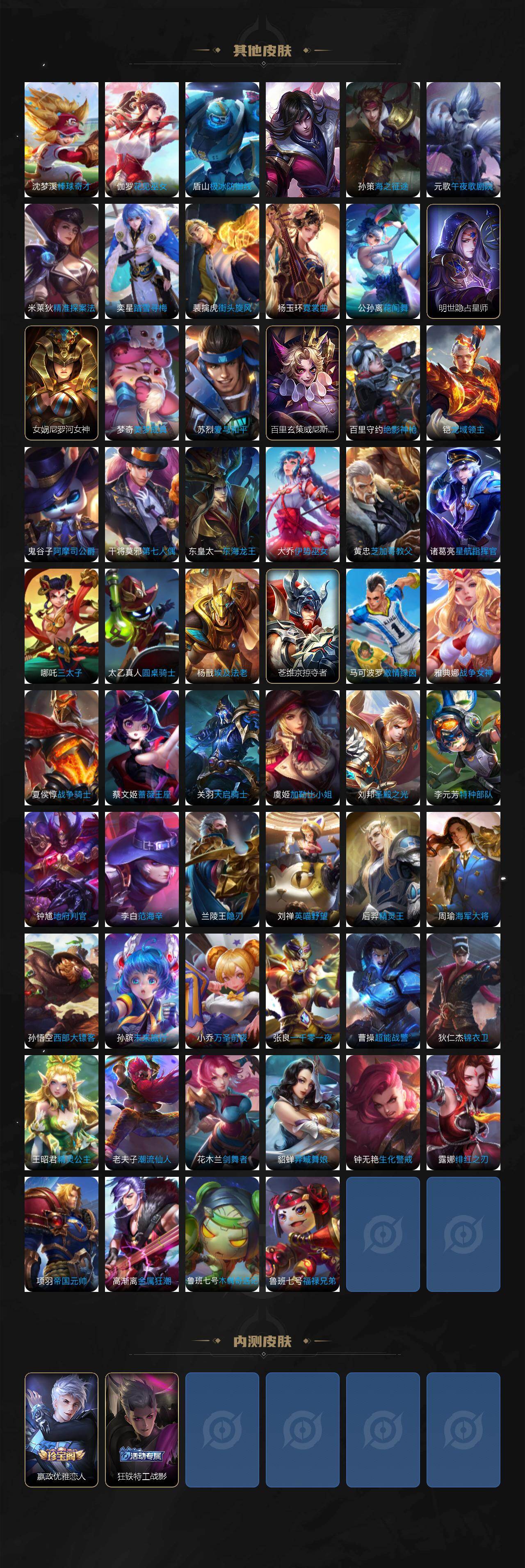 【传说皮肤】:蔡文姬愿照福禄聚,典韦战鼓燎原,马超琥珀纪元,铠琥珀纪元,澜逐花归海,甄姬至美化雀舞,吕布遇见神鼓,宫本武藏惊梅引,东皇太一灼幽烈阳,狄仁杰神器狴犴令,赵云淬星耀世,王昭君乞巧织情,西施游龙清影,周瑜音你心动,小乔音你心动,铠绛天