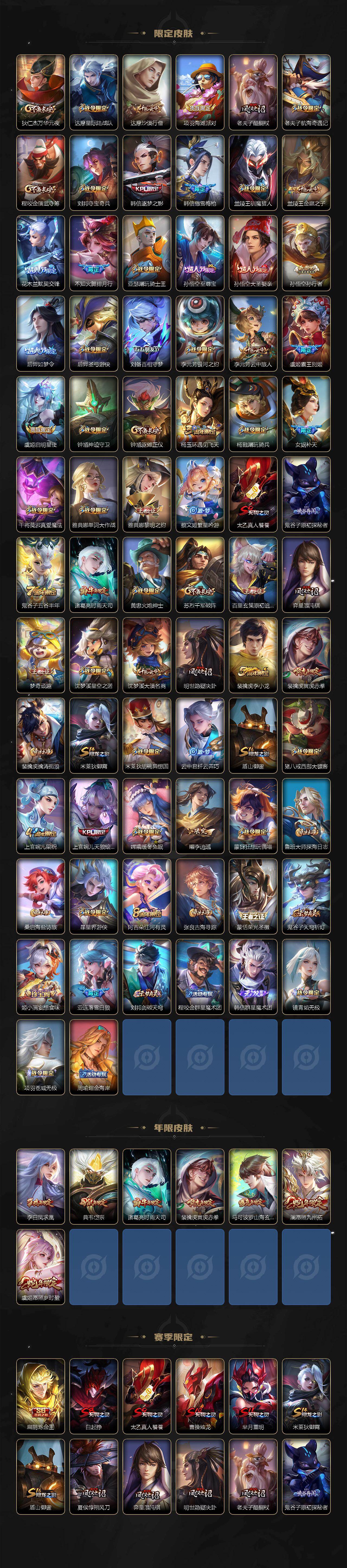 【传说皮肤】:澜愿照九州拓,虞姬愿照岁时盈,云缨幻光神枪,裴擒虎祥瑞亨通,桑启鸣野蒿,夏侯惇霜北刀,亚连落雪白狼,典韦战鼓燎原,澜逐花归海,露娜霜月吟,鲁班七号时之奇旅,吕布遇见神鼓,马可波罗妄想实况,公孙离记忆之芯,李白诗剑行,不知火舞绯月行,孙尚香音你闪耀,马超无双飞将,女娲补天,裴