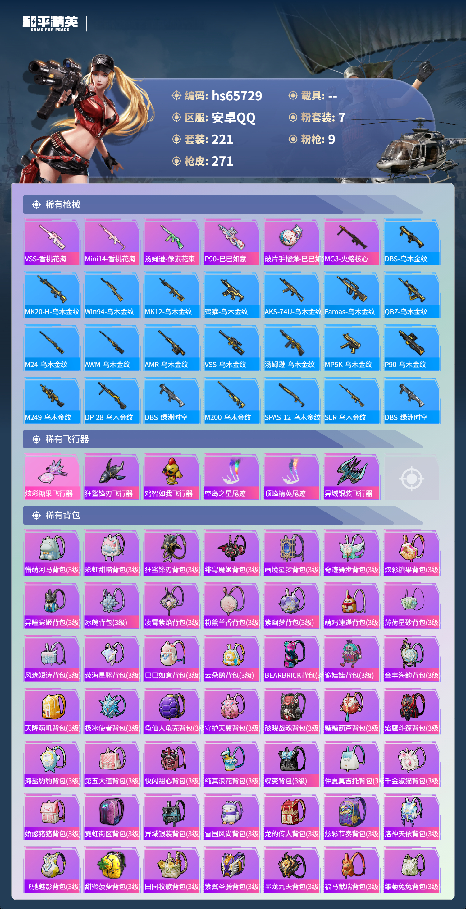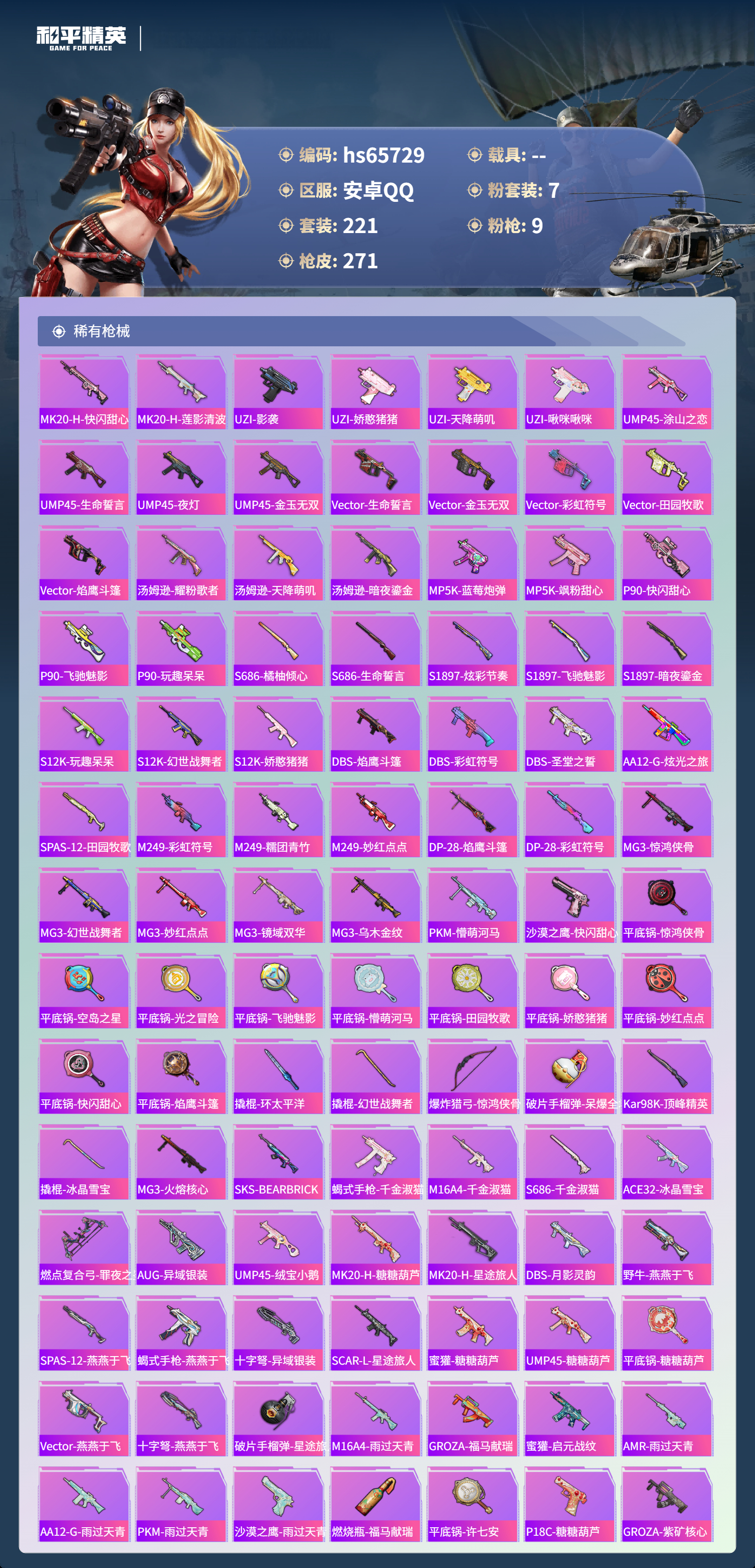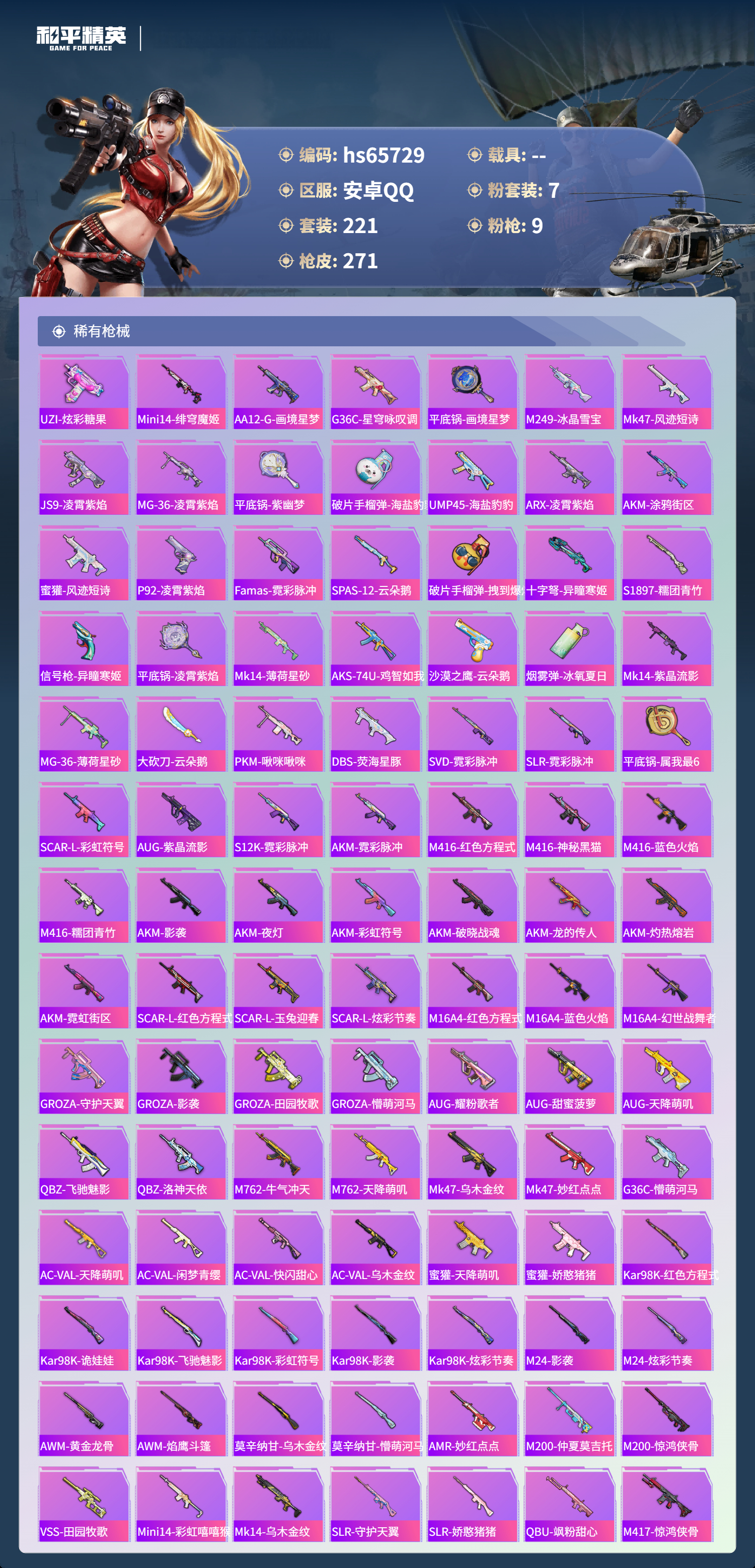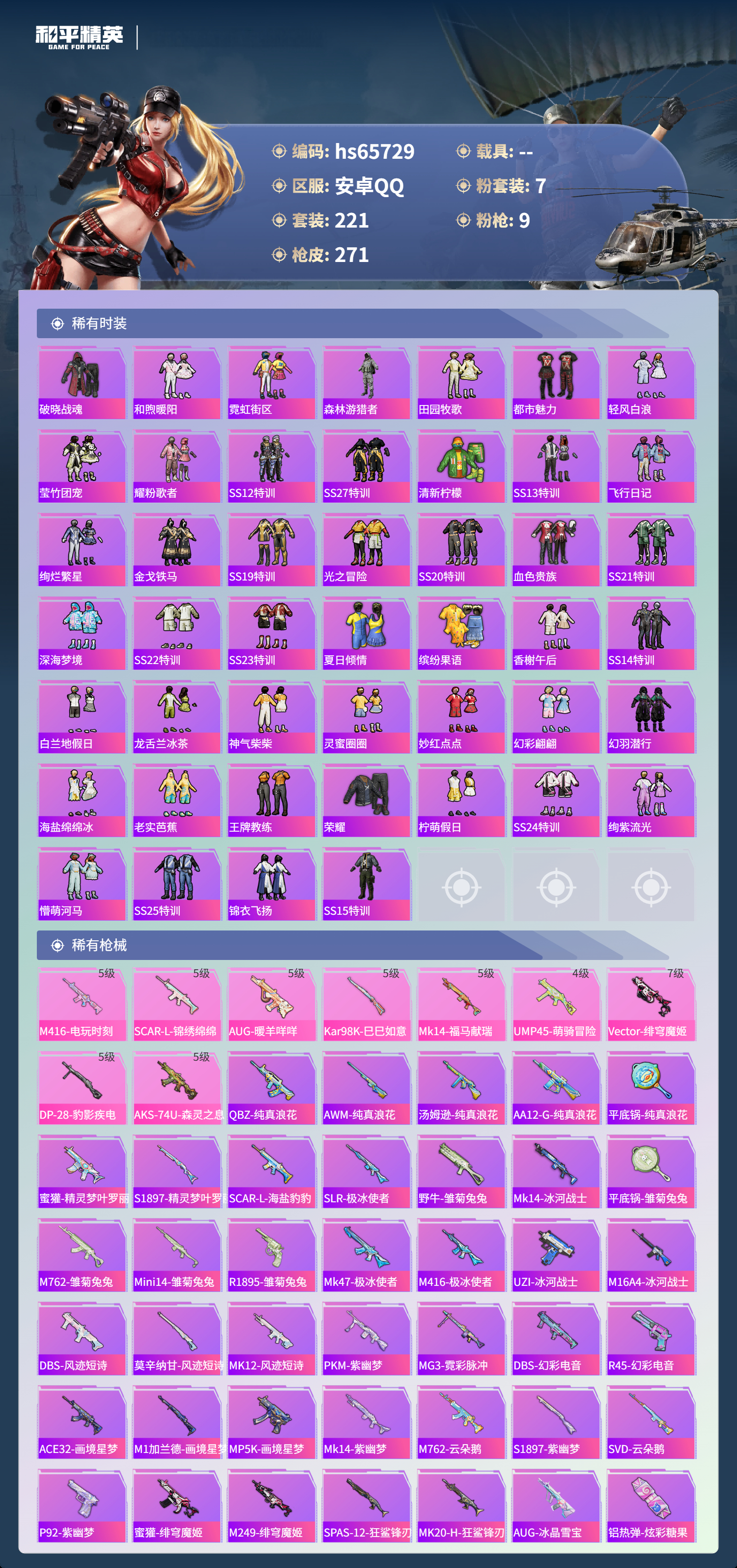 hs65729 安卓手Q-21王牌印记-7粉装-9特效枪-85317热力值-221套装-271枪皮-3卓越印记-2传奇印记
