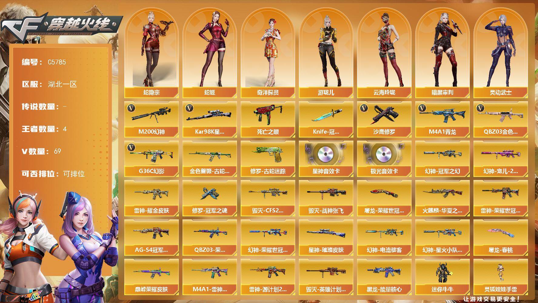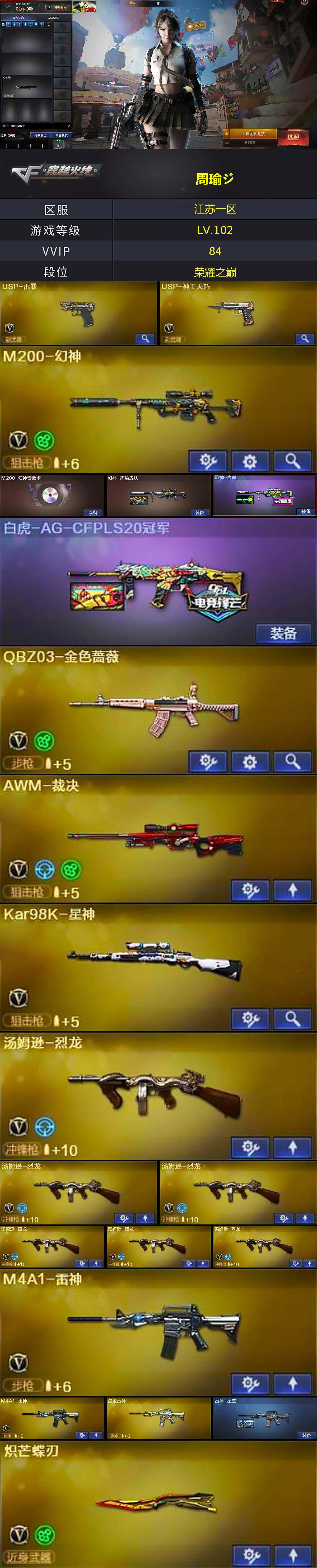 【ky4909】江苏一区-84V-3王者-3炫金【热门武器】:QBZ03-金色蔷薇,M200-幻神,死亡之眼,Kar98K-星神,M4A1-黑骑士,汤姆逊-烈龙*6,加特林-炼狱,斯泰尔-蝴蝶,USP-雷暴,沙鹰-修罗*3,炽芒蝶刃【王者炫金武器】:王者之幻,炫金雷神,炫金武士,炫金毁灭【音效卡】:M200-幻神音效卡,Barrett-毁灭音效卡,枪娘语音包-阿敏,火线妹语音包【皮肤】:幻神-周瑜皮肤,幻神-青鹤,白虎-AG-CFPLS20冠军,雷神-星空,火麒麟-百城,火麒麟-心动糖果,毁灭-