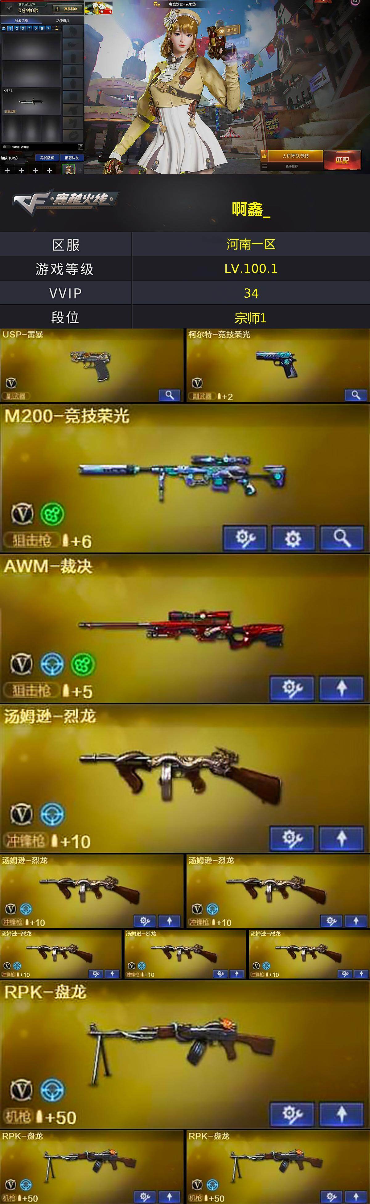 【ky4842】河南一区-34V-1王者-1炫金【热门武器】:M200-竞技荣光,M4A1-黑骑士,汤姆逊-烈龙*6,RPK-盘龙*3,加特林-炼狱*2,USP-雷暴【王者炫金武器】:炫金毁灭【皮肤】:火麒麟-雷神,火麒麟-平天大圣,毁灭-神秘黑洞皮肤,黑骑士-暗月*2,黑骑士-地狱火【角色】:电竞教官-云悠悠,王者葵-惊若翩鸿,初恋灵狐,虎妞,潘多拉-X【挑战大师】:激光毁灭者III【英雄级武器】:M4A1-黑龙,M4A1-黑骑士,AK47-无影,王者之烈-觉醒版,Barrett-毁灭,AWM