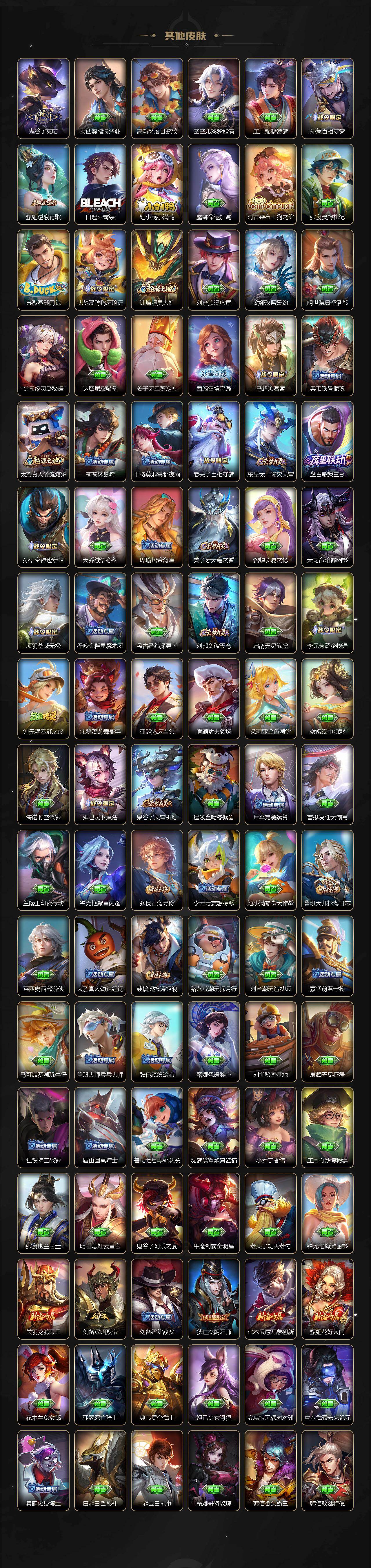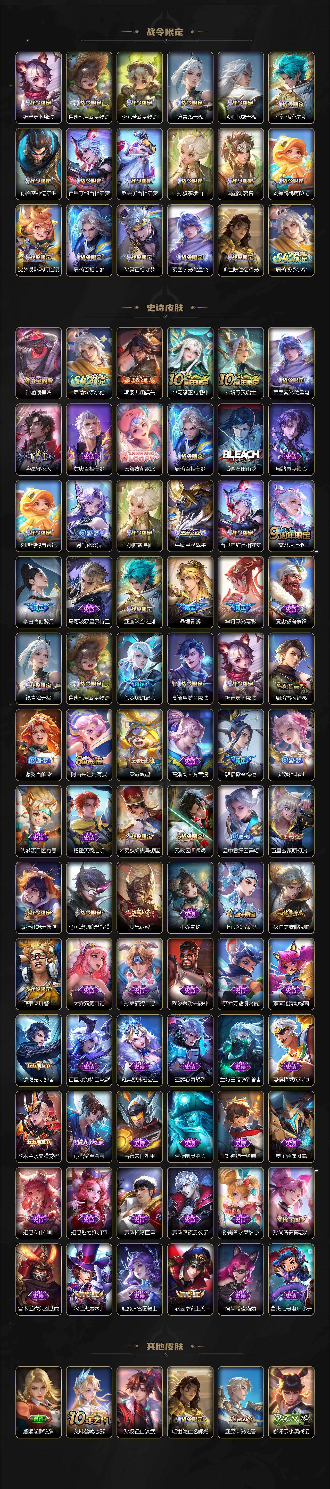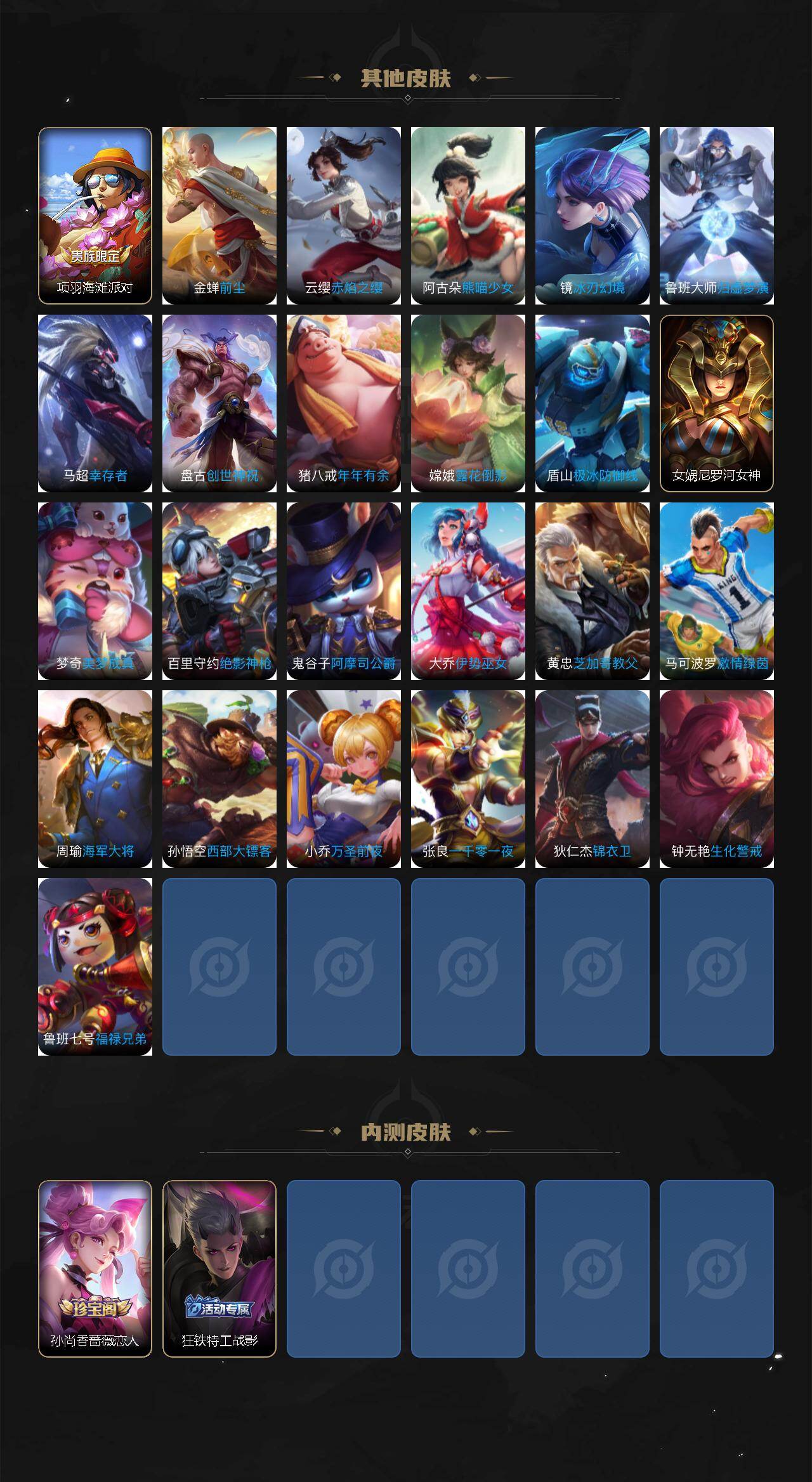 【传说皮肤】:后羿神树通天,妲己愿照众生和,云缨幻光神枪,桑启鸣野蒿,庄周牧神诗旅,露娜霜月吟,宫本武藏惊梅引,马超无双飞