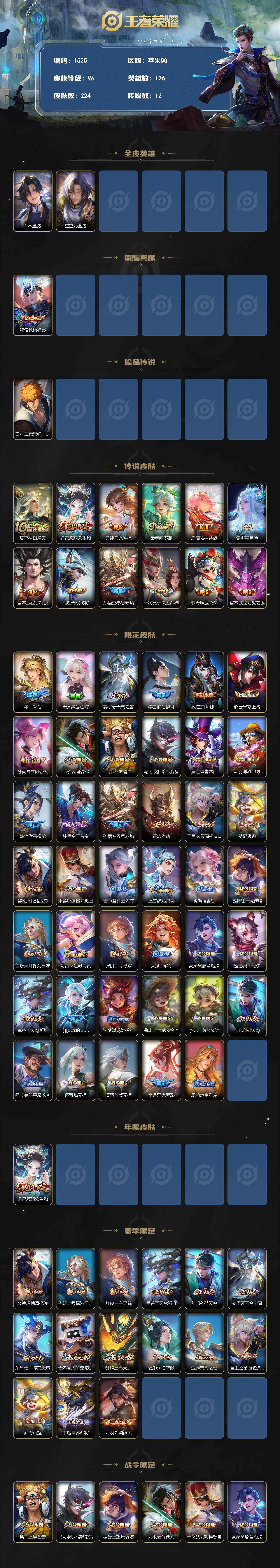 打野40段 金标宫本 2565850 王者荣耀账号 苹果Q-V6-最强王者段位-126英雄-224皮肤-1典藏皮肤-1珍品传说-12传说-76史诗