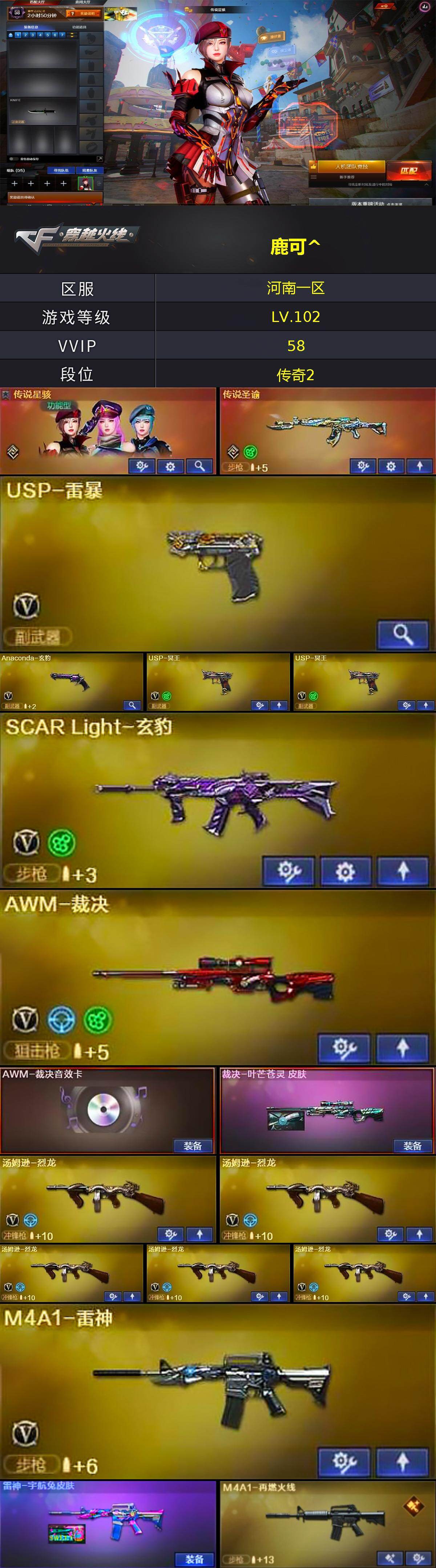 【ky4884】河南一区-56V-6王者-0炫金【传说武器】:传说圣谕【传说角色】:传说星骇【热门武器】:传说圣谕,死亡之眼,汤姆逊-烈龙*5,USP-雷暴,柯尔特-赛博朋克【王者炫金武器】:AK47-雷暴王者,王者森力,王者玉锋,斩神刀-雷暴王者【音效卡】:AWM-裁决音效卡,Barrett-碧霄极光音效卡,炼狱-百战金芒-庆典舞曲音效卡,死神-雪域霜狐-怀旧音效卡,柯尔特-百战金芒-庆典舞曲音效卡【皮肤】:裁决-叶芒苍灵 皮肤,雷神-宇航兔皮肤,M4A1-再燃火线,屠龙-春桃 皮肤,龙啸-纸