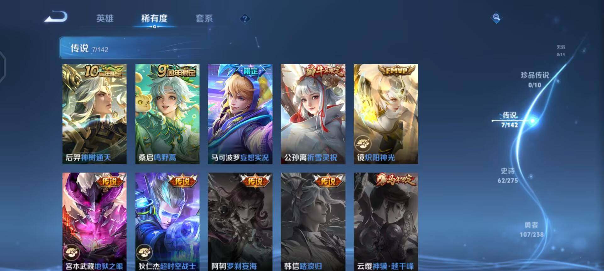 【传说皮肤】:后羿神树通天,桑启鸣野蒿,马可波罗妄想实况,公孙离祈雪灵祝,镜炽阳神光,宫本武藏地狱之眼,狄仁杰超时空战士